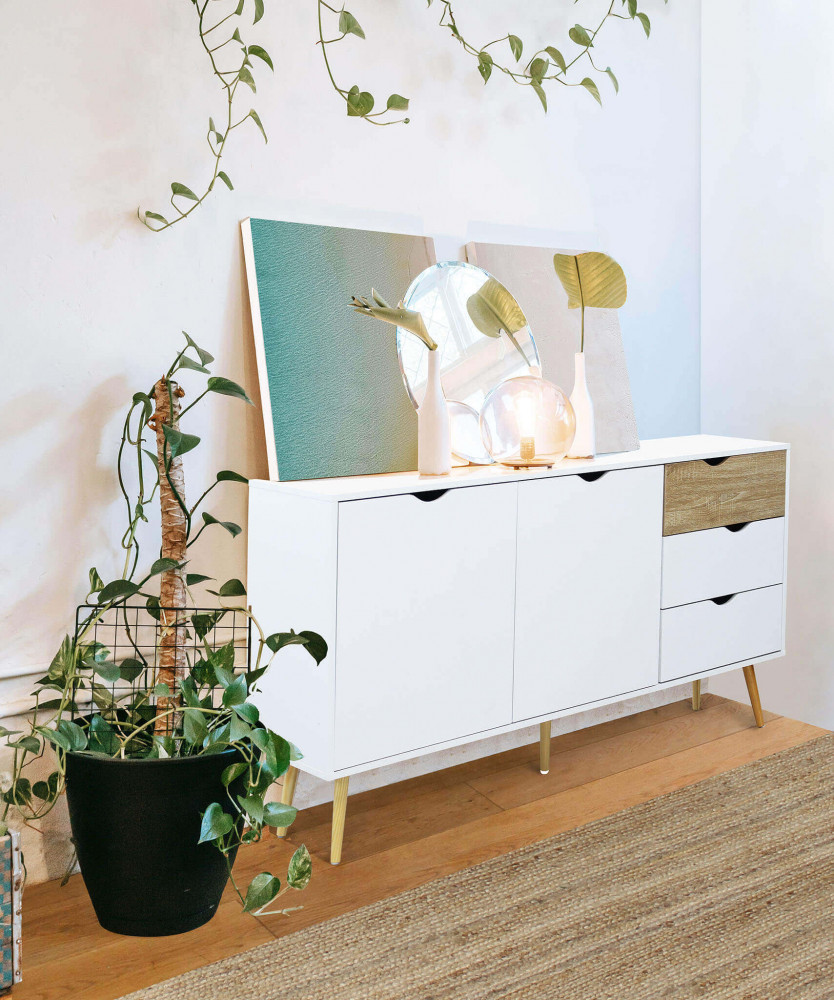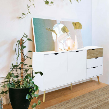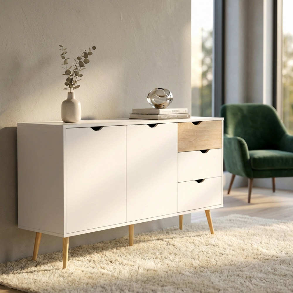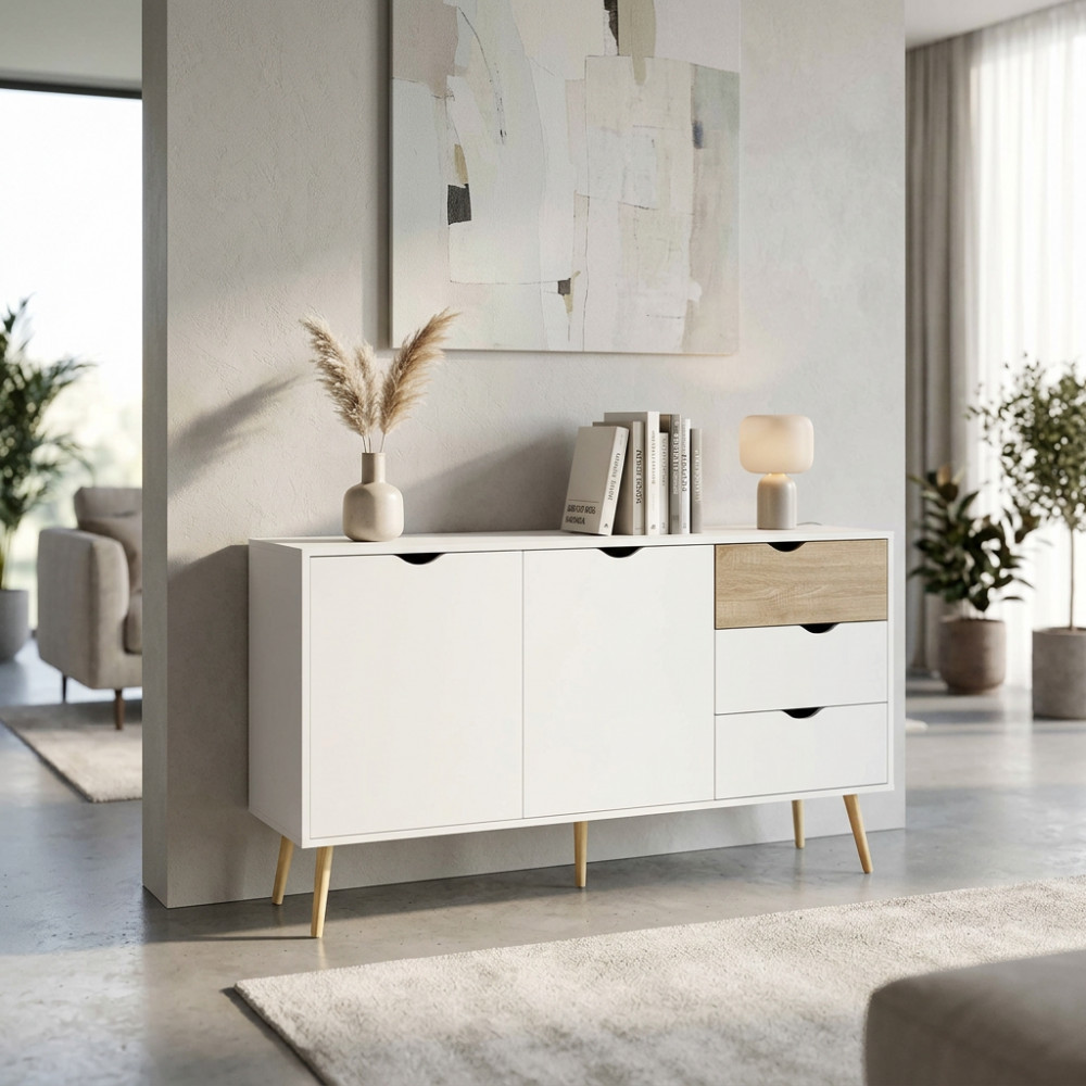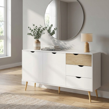 - Dati Tecnici Mobile con 2 ante e 3 cassetti in legno bianco e naturale Dimensioni: cm 147 x 39 x 82 h