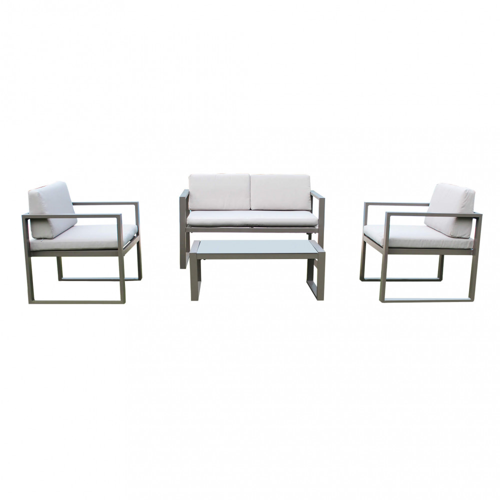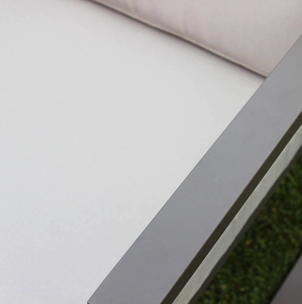 Struttura in alluminio verniciato BIANCO, TORTORA, TAUPE o ANTRACITE, cuscini in poliestere vetro tavolino 5 mm Dimensioni: D.120x66x63/P.65x66x63/T.92x51,5x35