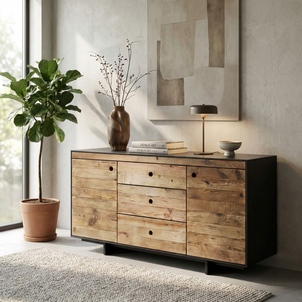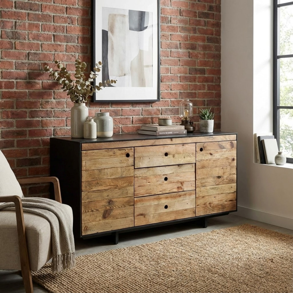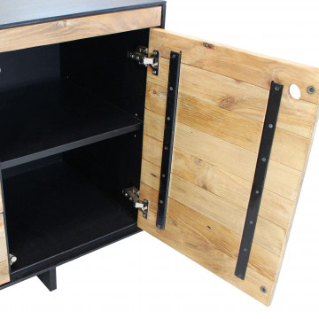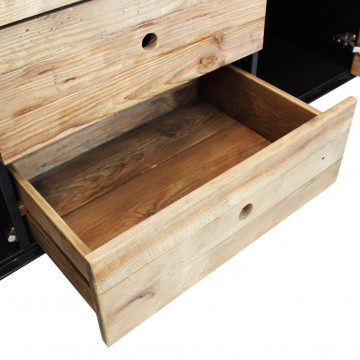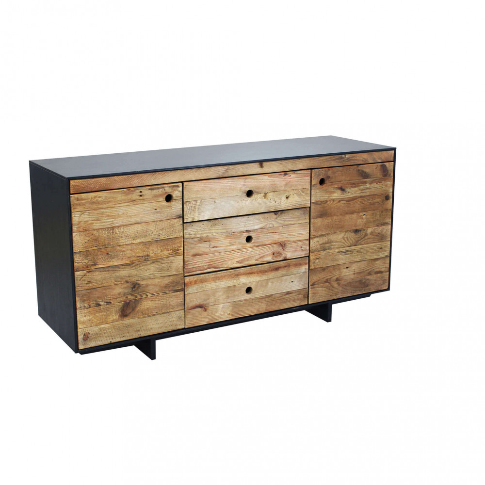- Dati Tecnici Mobile con 3 cassetti e 2 ante in legno di pino riciclato naturale e nero Dimensioni: cm 150 x 48 x 76 h