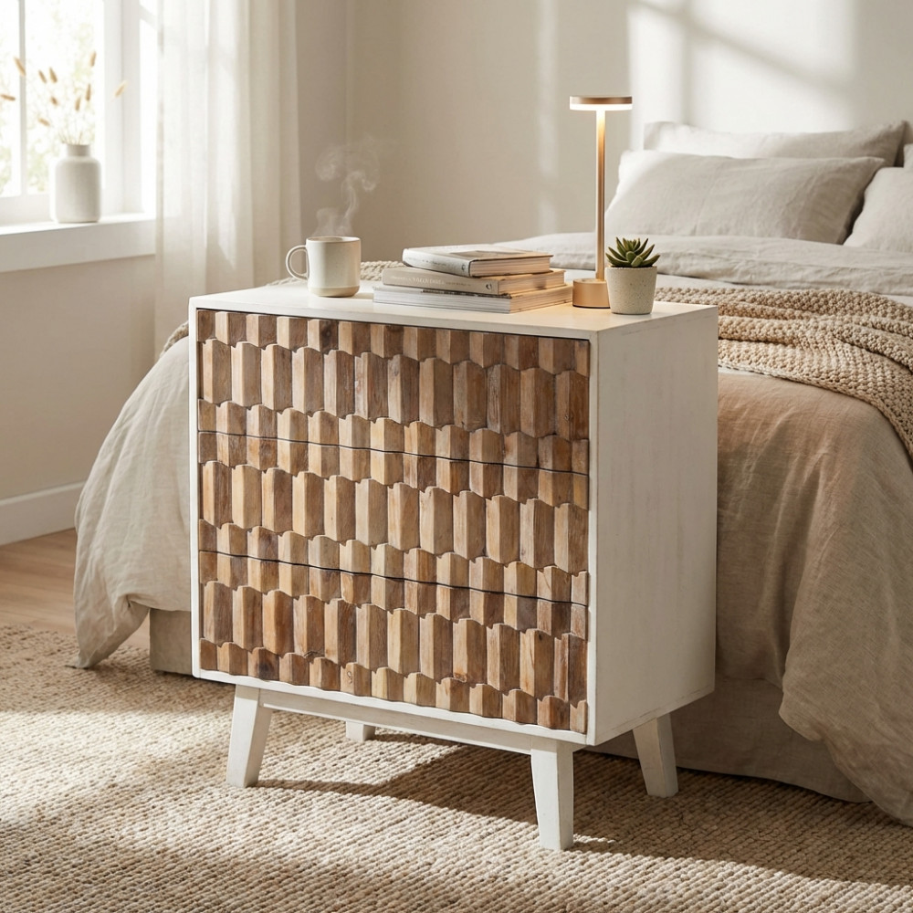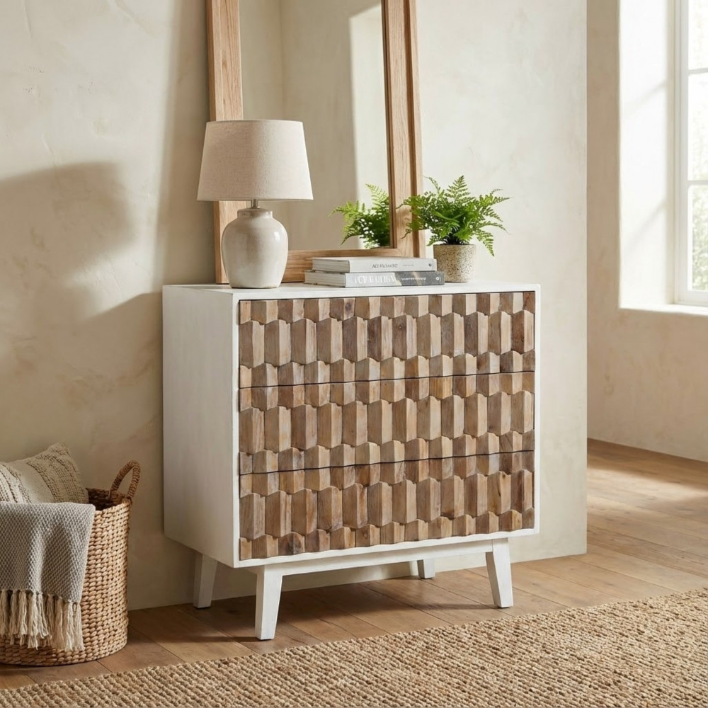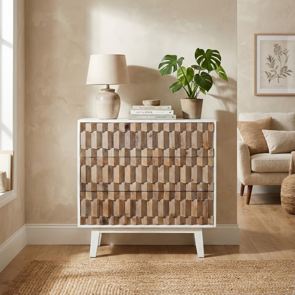 - Dati Tecnici Mobile bianco con 3 cassetti con decoro color naturale Dimensioni: cm 88 x 45 x 89 h