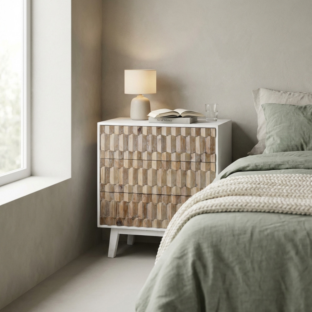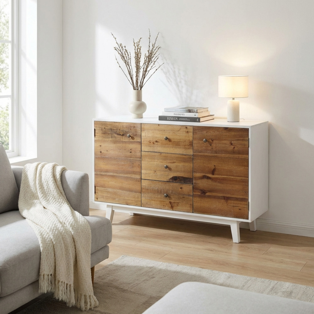 - Dati Tecnici Mobile bianco con 2 ante e 3 cassetti con decoro color naturale Dimensioni: cm 142 x 45 x 83 h