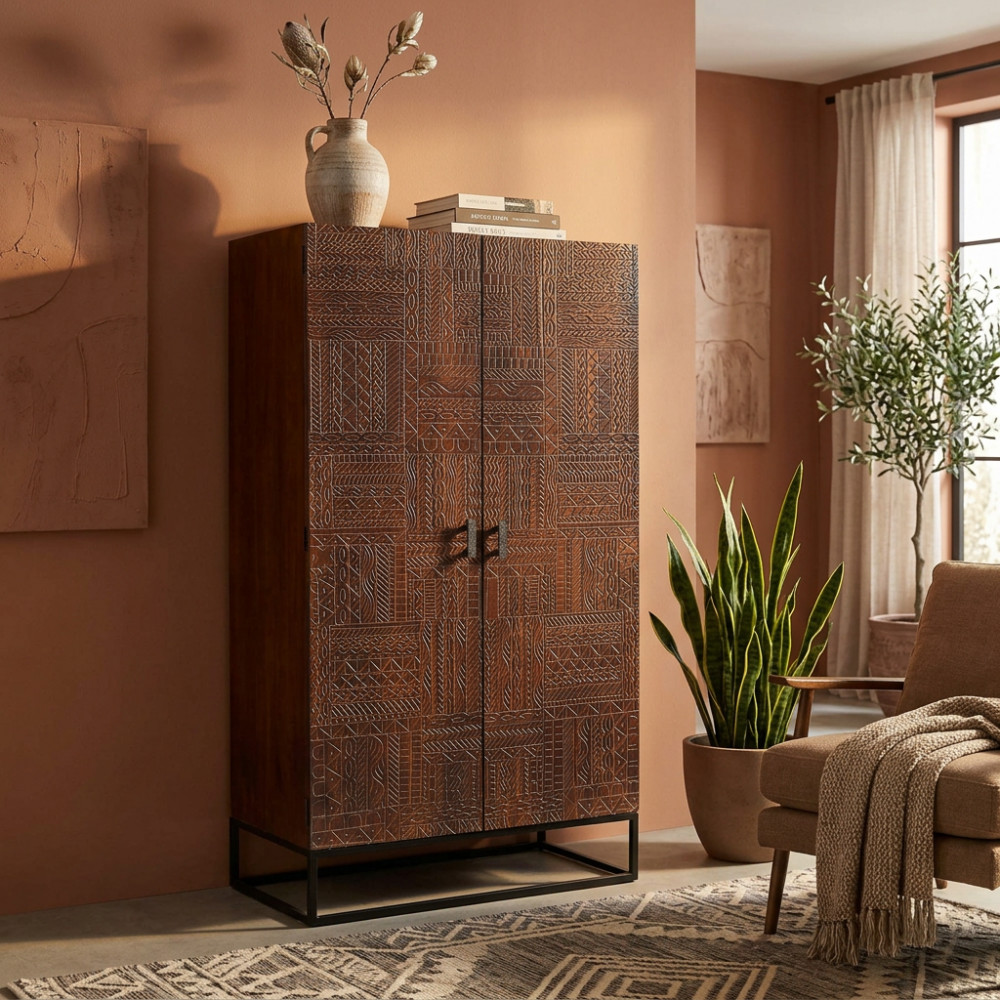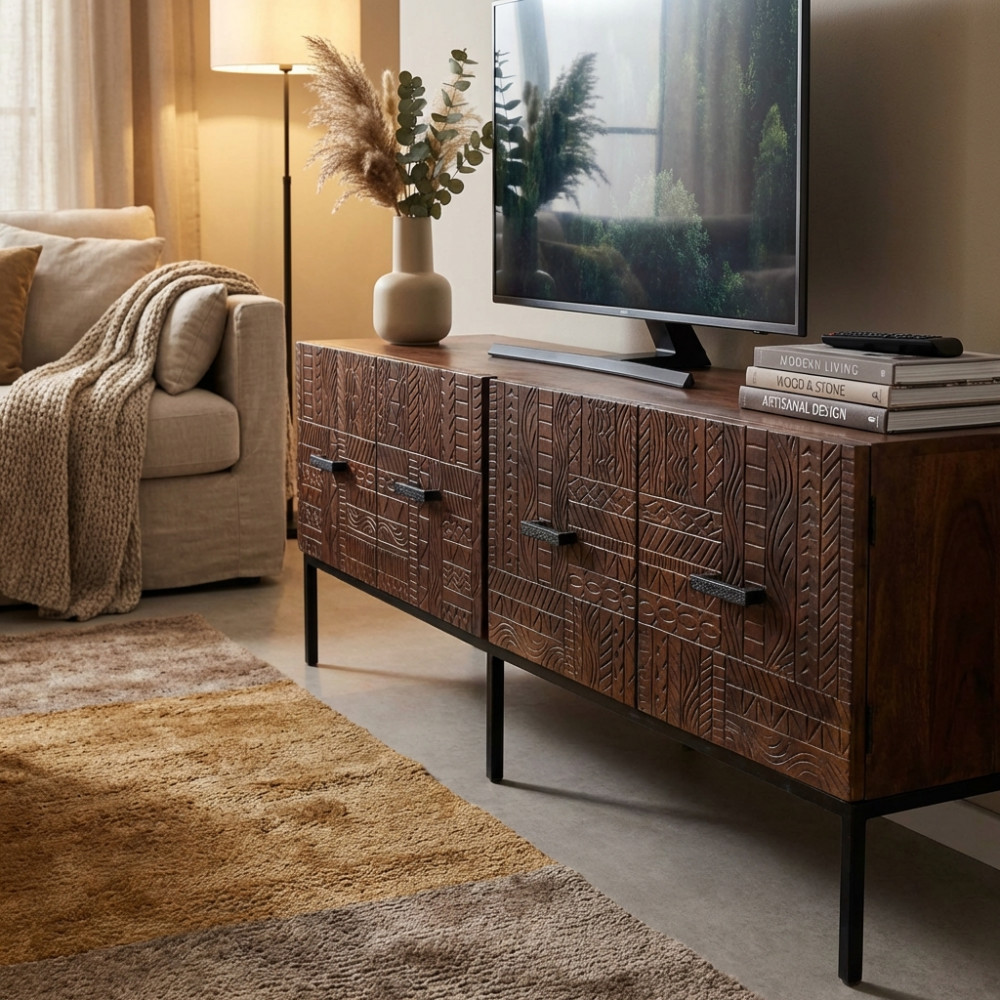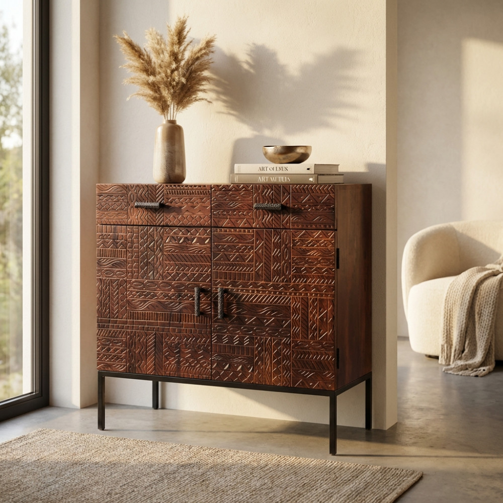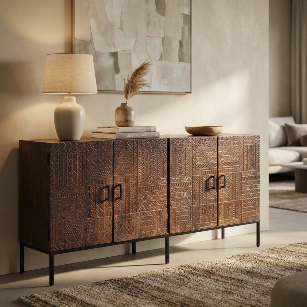 - Dati Tecnici Consolle con decoro wengé in legno di mango con struttura in ferro Dimensioni: cm 120 x 30 x 76 h