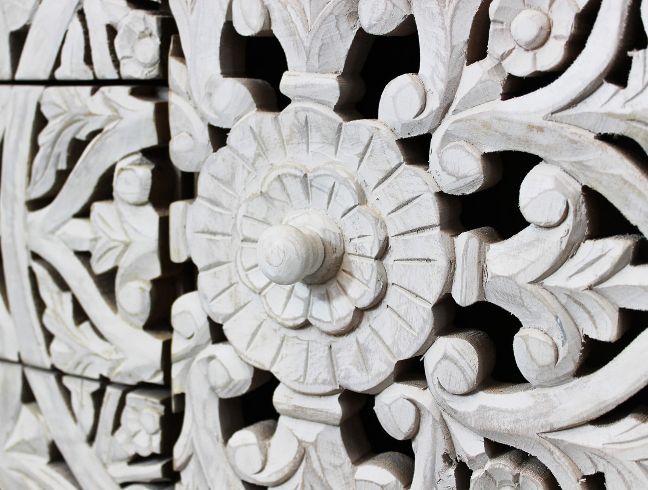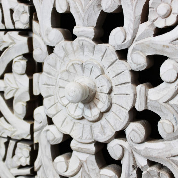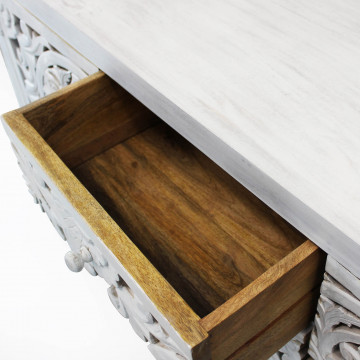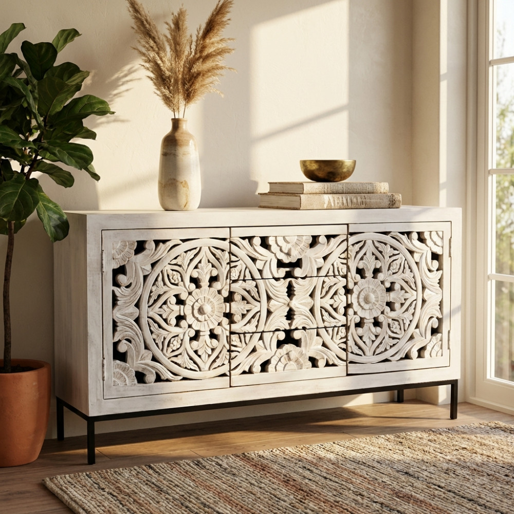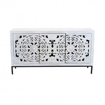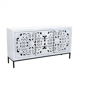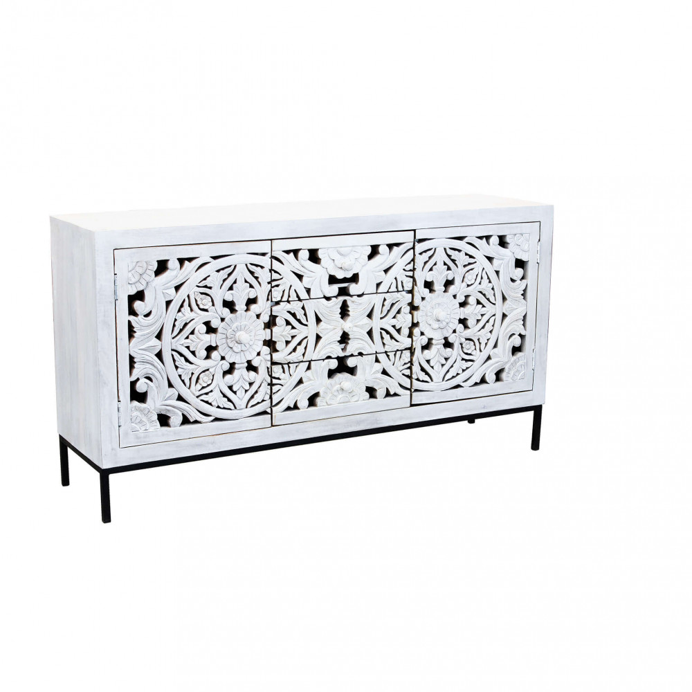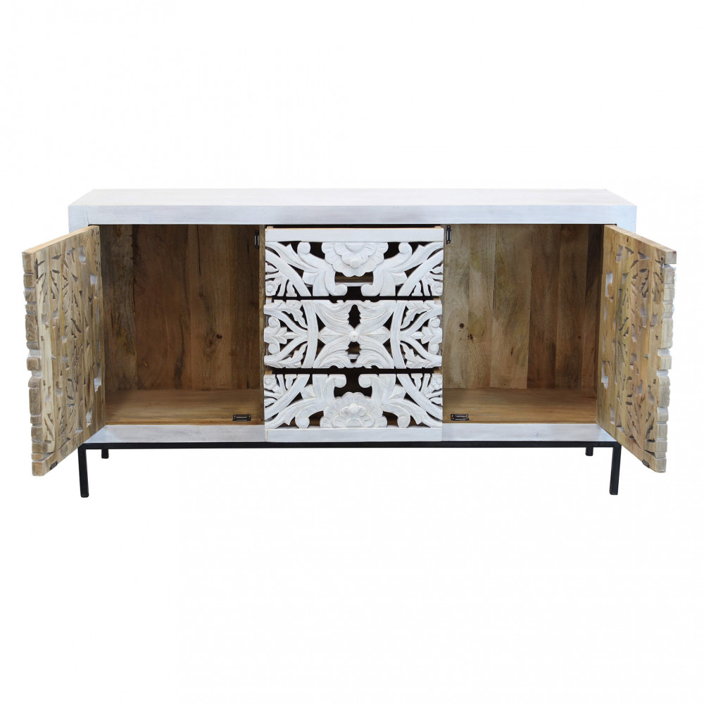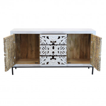 - Dati Tecnici Mobile con decoro sbiancato con 2 ante e 3 cassetti in legno di mango con struttura in ferro Dimensioni: cm 150 x 40 x 80 h