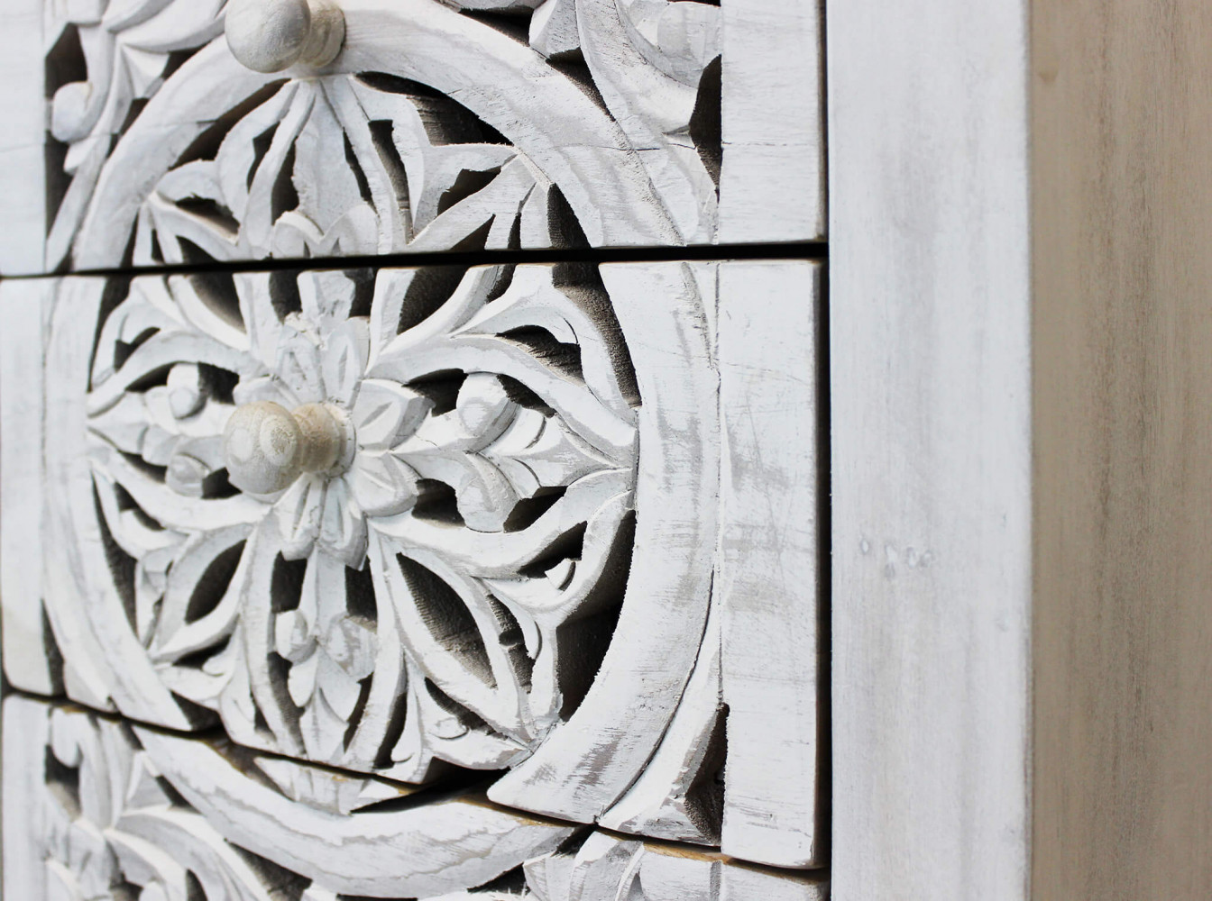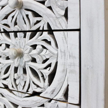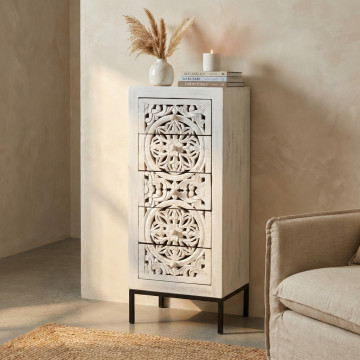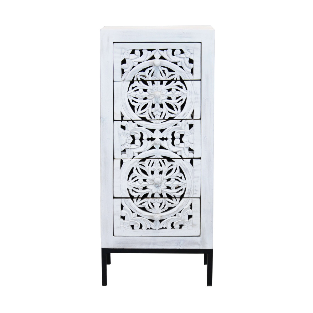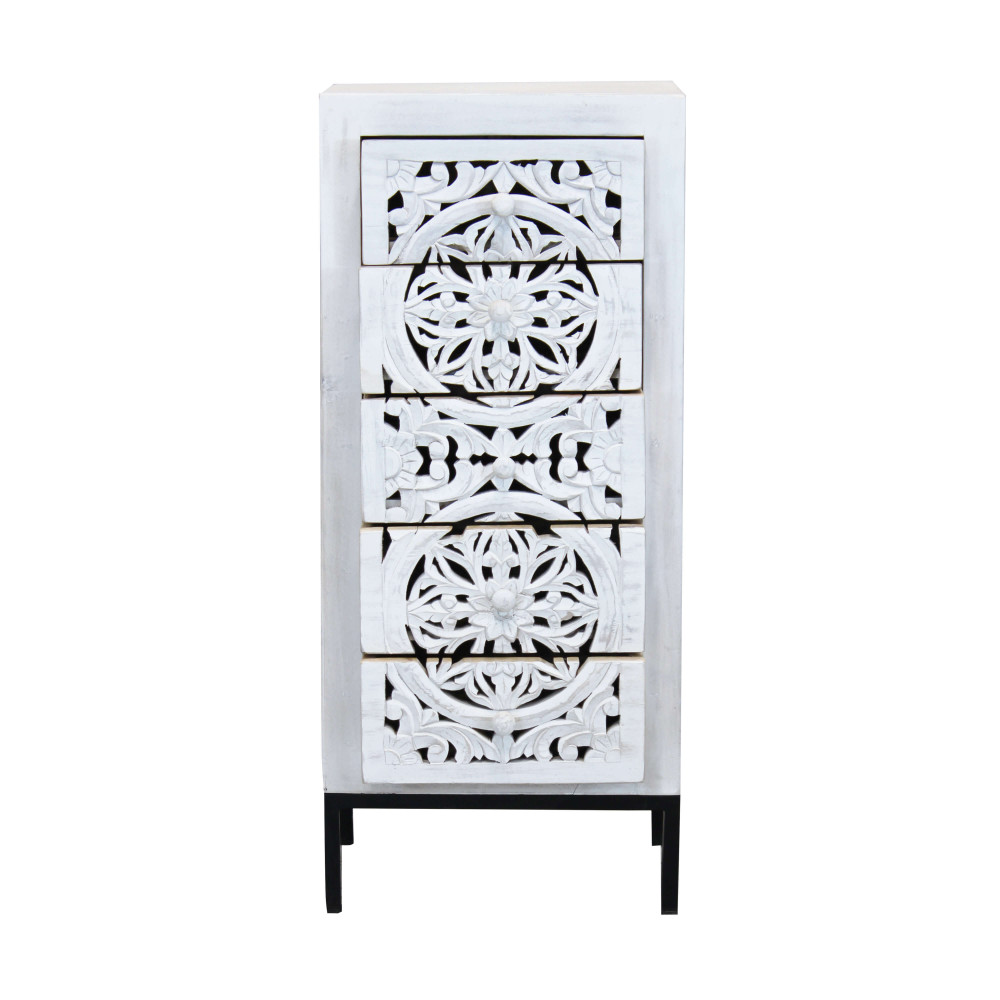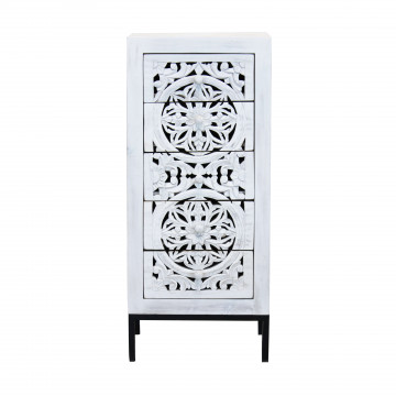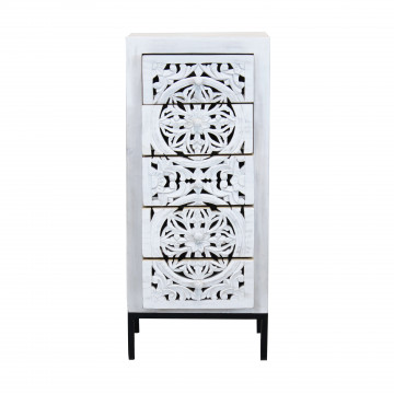 - Dati Tecnici Mobile con decoro sbiancato con 5 cassetti in legno di mango con struttura in ferro Dimensioni: cm 45 x 35 x 105 h