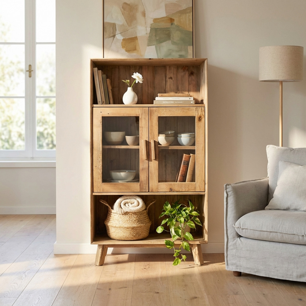 - Dati Tecnici Mobile con 2 ripiani e 2 ante legno di pino riciclato Dimensioni: cm 90 x 40 x 160 h