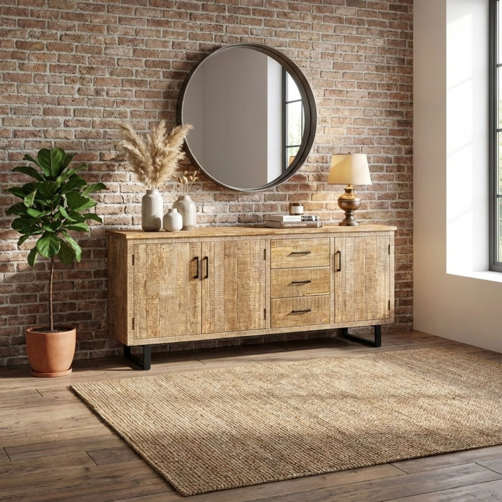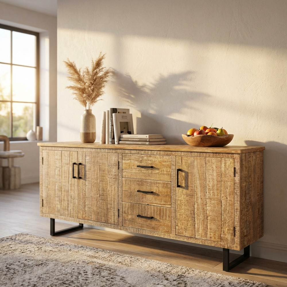- Dati Tecnici Mobile naturale con 3 ante e 3 cassetti con gambe in metallo nero Dimensioni: cm 200 x 45 x 83 h