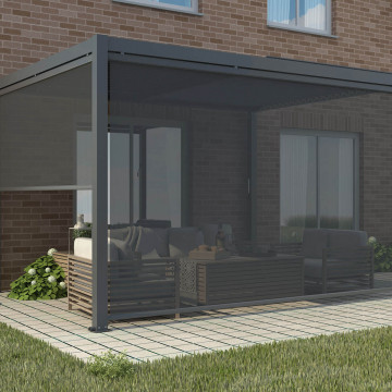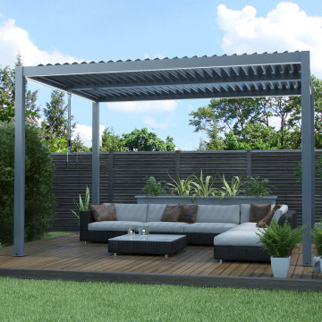 Struttura in alluminio bianco o grigio scuro copertura a lamelle frangisole orientabili a movimentazione manuale resistente a tutte le intemperie Dimensioni: m 4 x 4 x 2,5 h