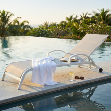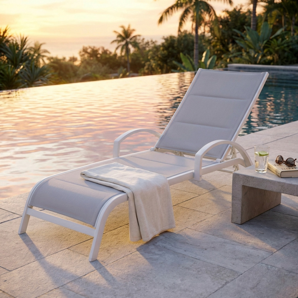 Struttura in alluminio verniciato BIANCO, TAUPE o ANTRACITE Textilene imbottito ECRU' con braccioli Dimensioni: cm 196,5 x 71 x 92,5 h