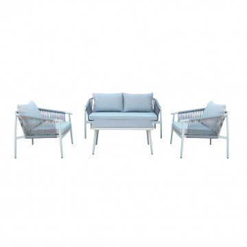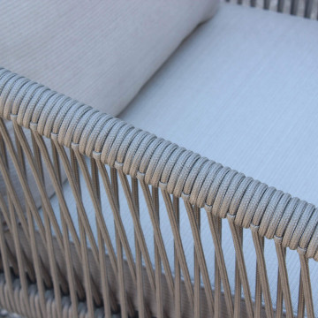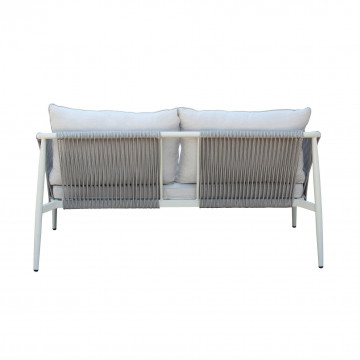 Struttura in alluminio verniciata a polvere GRIGIO SCURO o GRIGIO CHIARO braccioli e schienali rivestimento in corda tonda sintetica cuscini 15 cm tavolino con vetro temprato 5 mm Dimensioni: D.152x80x73/P.71x80x73/T.100x55x45