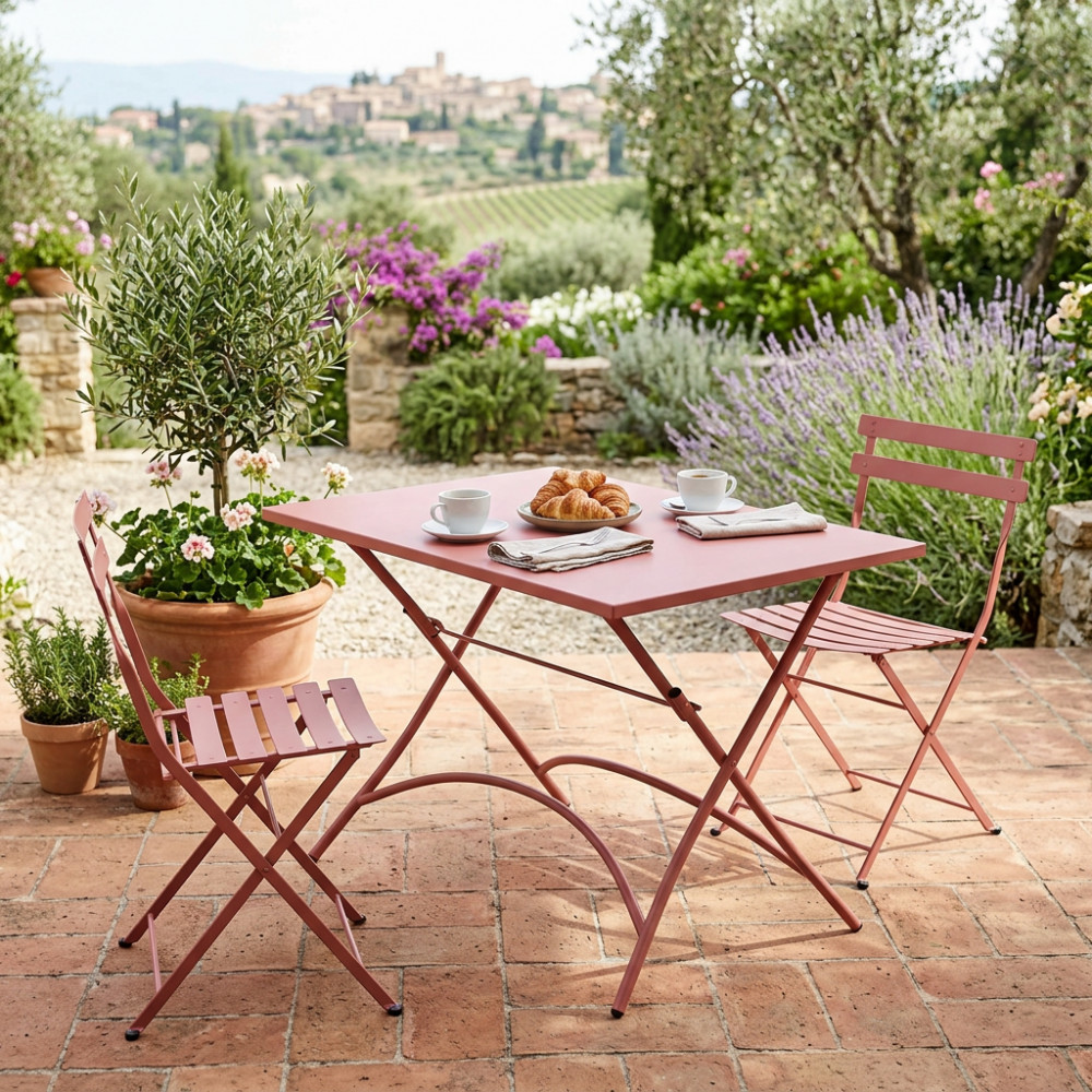 Metallo TORTORA, BIANCO, GRIGIO, TAUPE, ROSSO o VERDE piano pieghevole, tubi Ø 19 x 1,4 mm trattamento da esterno antiruggine in elettroforesi Dimensioni: cm 110 x 70 x 72 h