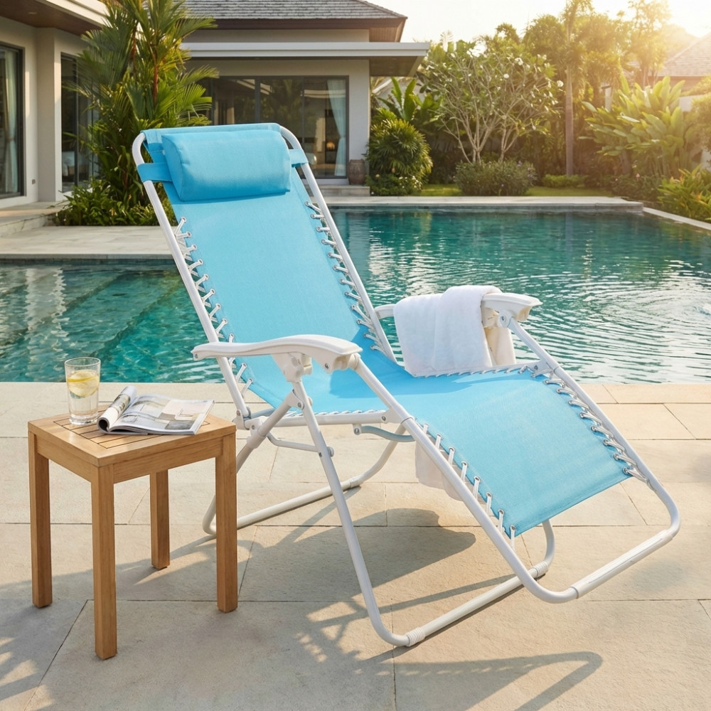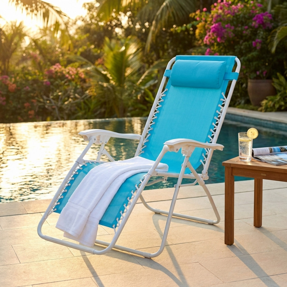 Dati Tecnici Disponibile BEIGE, BLU, AZZURRO, GRIGIO SCURO, NERO, o VERDE SCURO struttura in acciaio ANTRACITE Ø 22 x 1 mm, tessuto in textilene 2 x 1, portata max 110 kg. Dimensioni: cm 88 x 65 x 110 h