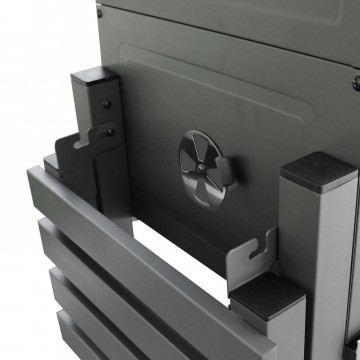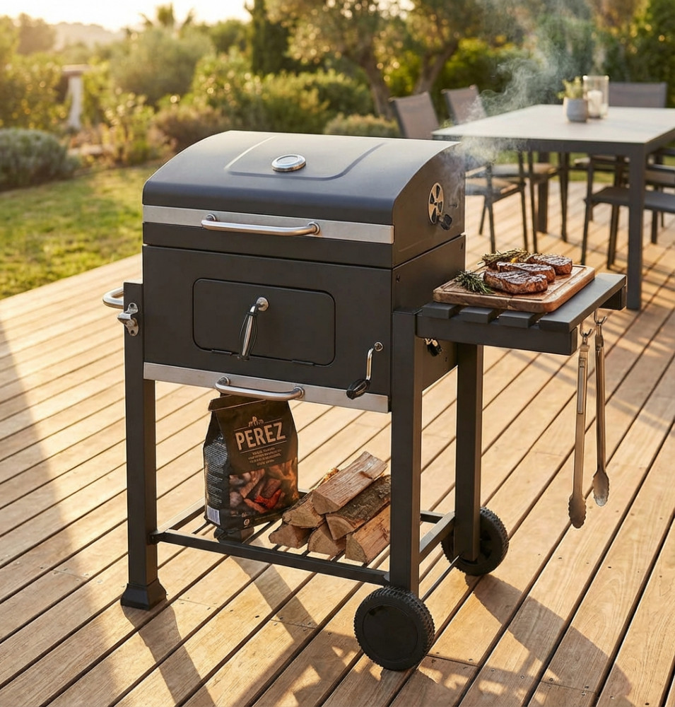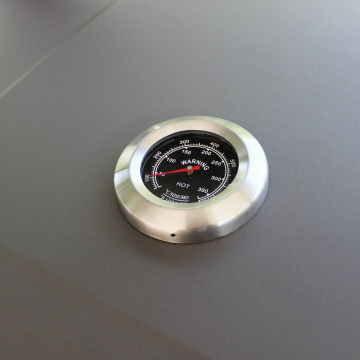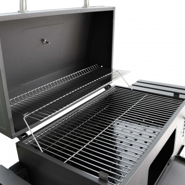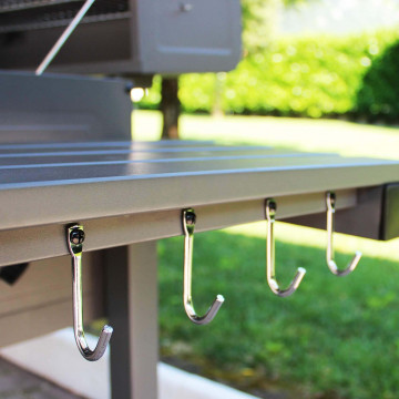 Dati Tecnici Struttura in acciaio verniciato NERO fornito di 2 griglie a ripiano diviso in 3 sezioni la parte centrale 815 x 240mm e 2 ripiani richiudibili laterali 415 x 250mm dotato di apri bottiglia e ganci laterali ripiano laterale in acciaio pieghevole coperchio con regolazione della temperatura Dimensioni: cm 160 x 65 x 107,5 h