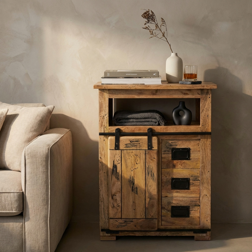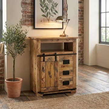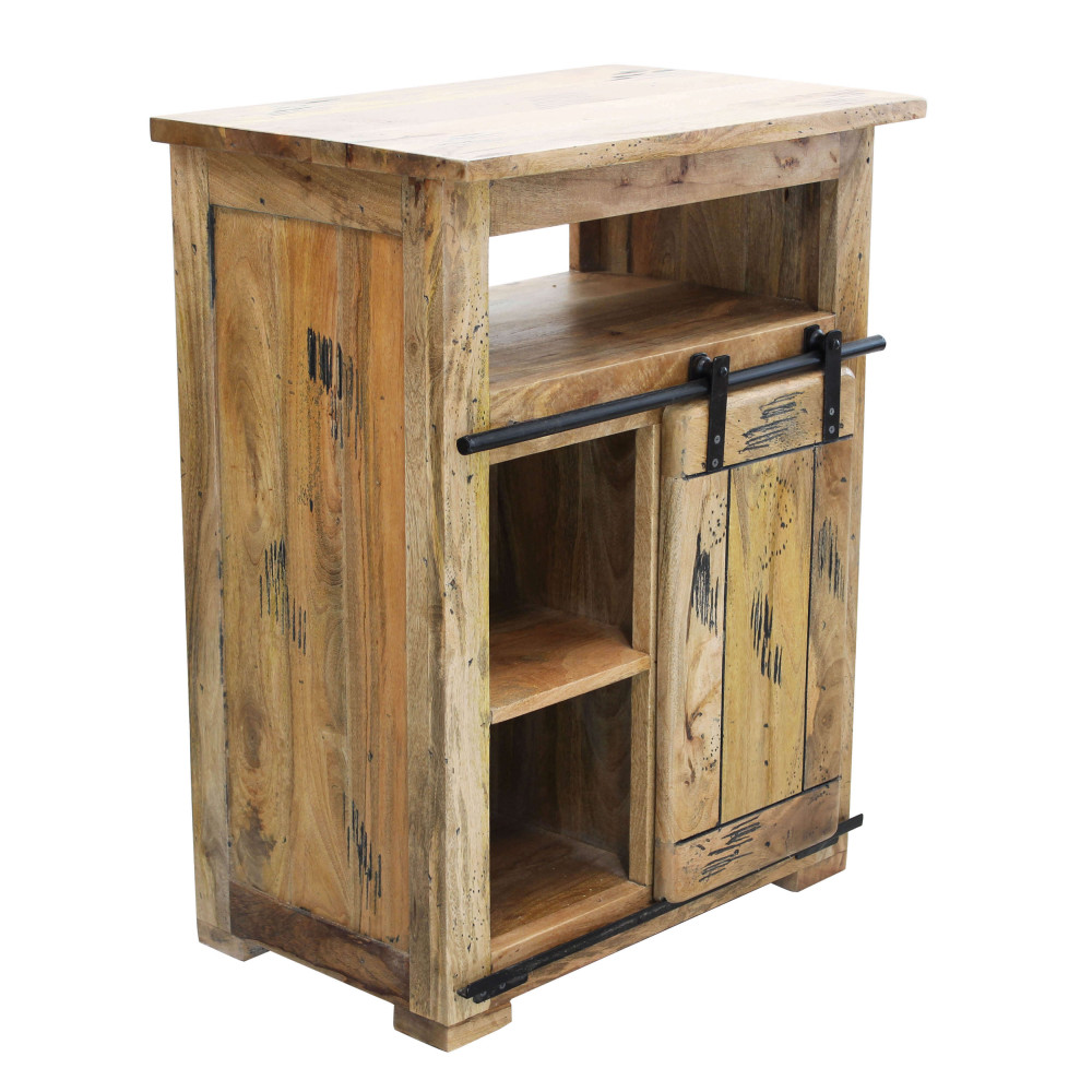- Dati Tecnici Mobile in legno di mango con 1 anta scorrevole, 1 ripiano e 3 cassetti Dimensioni: cm 70 x 45 x 90 h
