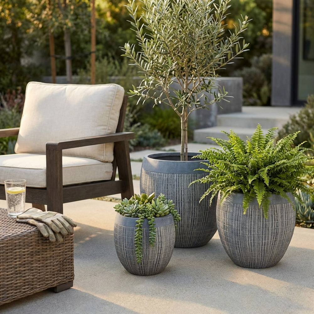 - Dati Tecnici Set di 3 vasi in fibra di sintetica Dimensioni: G.56x56x55/M.43,5x43,5x42,5/P.32x32x33,5