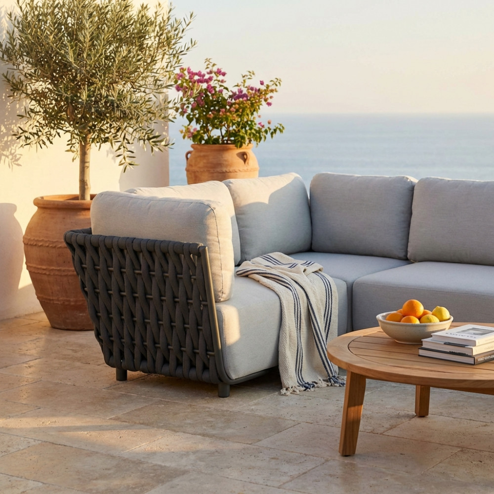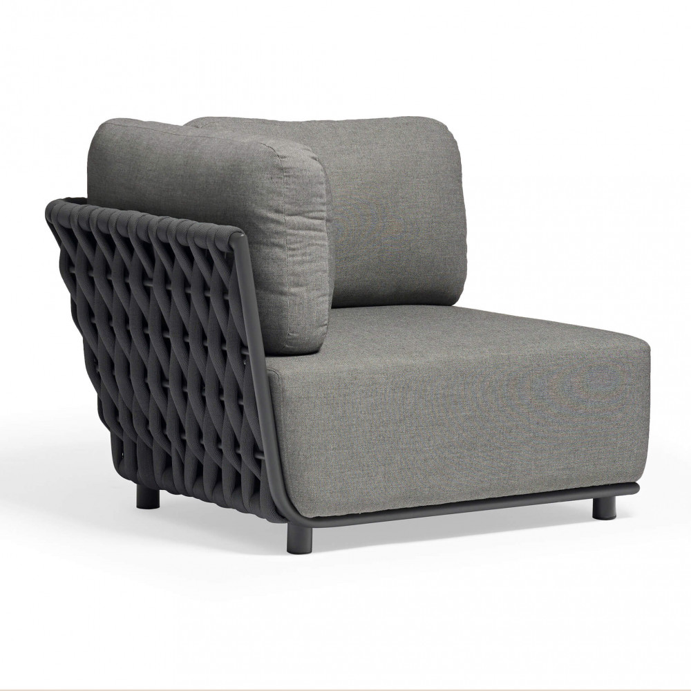 Struttura in alluminio ANTRACITE braccioli e schienali rivestimento in corda in PVC con imbottitura in gomma cuscini di spessore 15 cm, trattamento TPU idrorepellente Dimensioni: cm 102 x 85 x 83 h