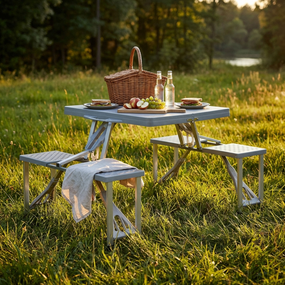 Struttura in acciaio, gambe in alluminio materiale: tavolino ABS / PP, sedia PP dimensione piegata: 85,5 x 10 x 38 cm Dimensioni: T.85,5x65x67/S.30x27x40