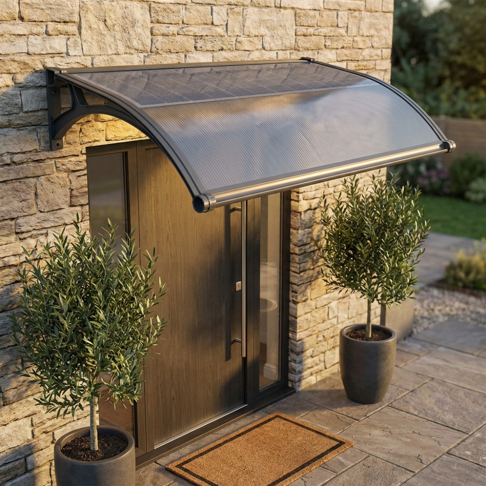 Pensilina con LED, PANNELLO SOLARE e braccetti in ABS Policarbonato 5,2 mm, si ricarica da solo non ha bisogno di manutenzione Dimensioni: cm 100 x 150 / P.95 x 145