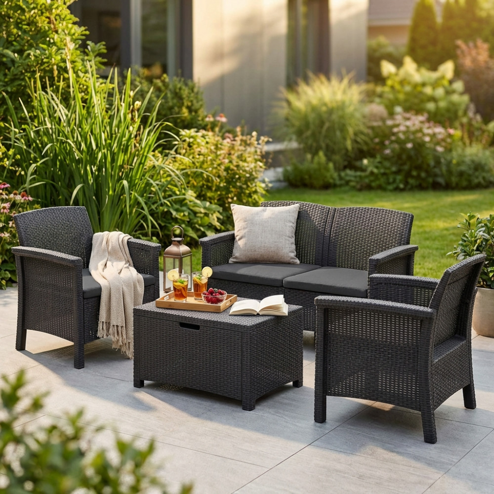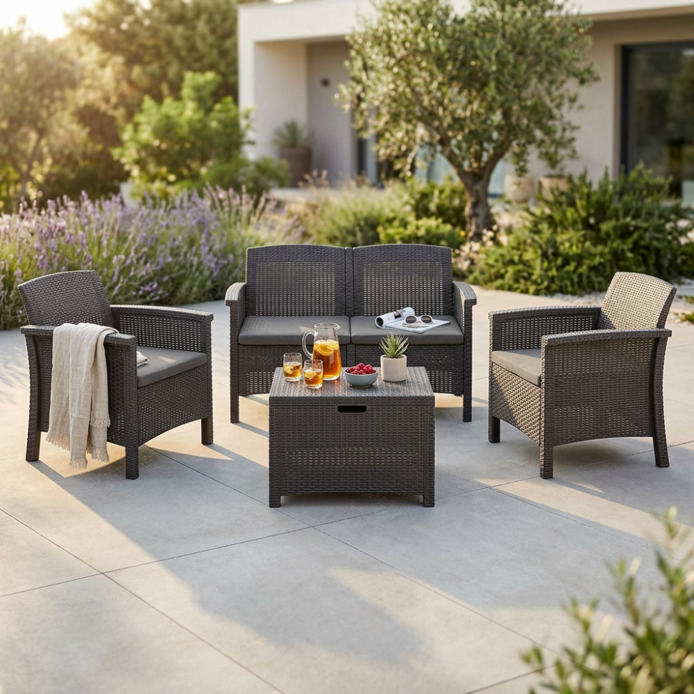 Struttura in plastica stampata, wicker BIANCO, NERO, o TAUPE con cuscini Dimensioni: D.117x64,5x76/P.63x64,5x76/T60x54,5x40,5