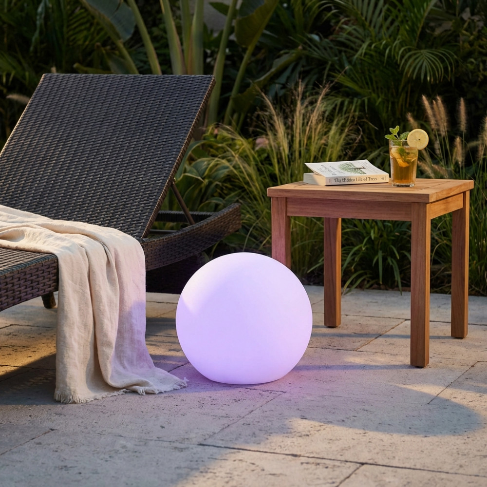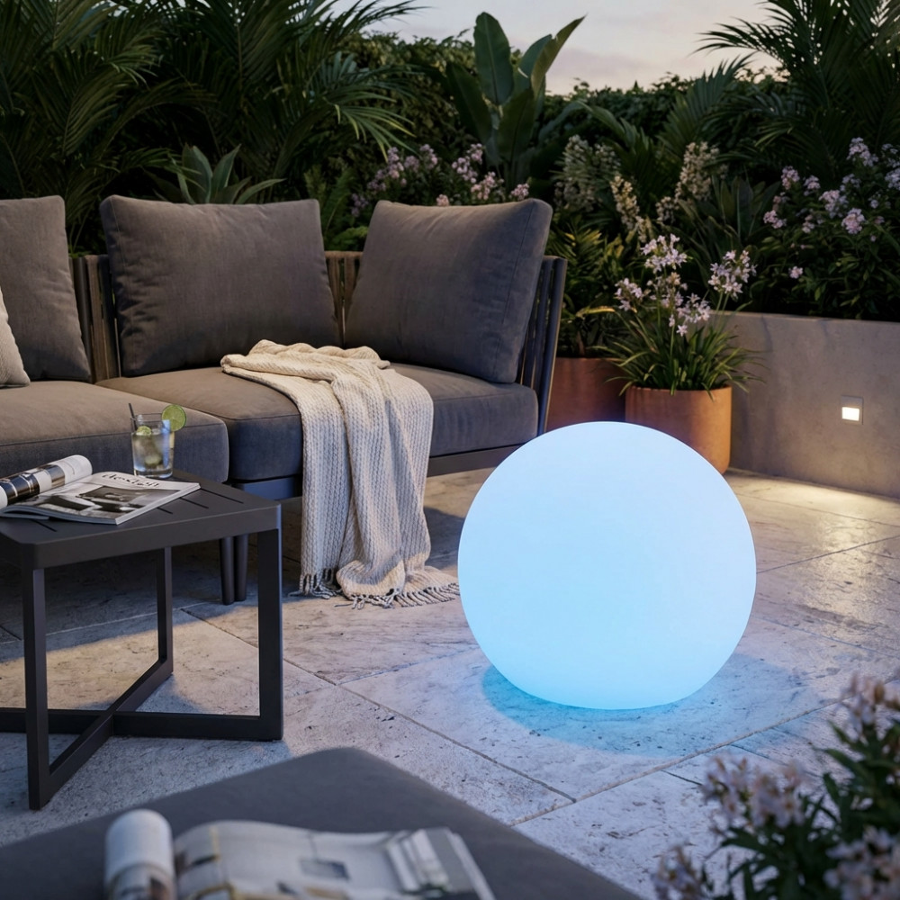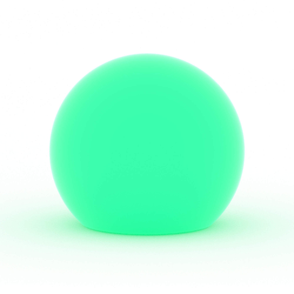 Dati Tecnici Sfera con impianto luce a led a batteria ricaricabile lampada a led rgb lampadina fornita assemblata, azionabile con telecomando, classe III, ip44, 4w (g4) 12vdc kit batteria ricaricabile max 8 ore caricatore universale 230v-ip20 incluso Dimensioni: cm Ø 70