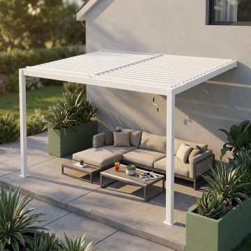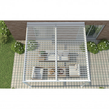 Struttura in alluminio bianco o grigio scuro copertura a lamelle frangisole orientabili a movimentazione manuale resistente a tutte le intemperie Dimensioni: m 4 x 4 x 2,5 h