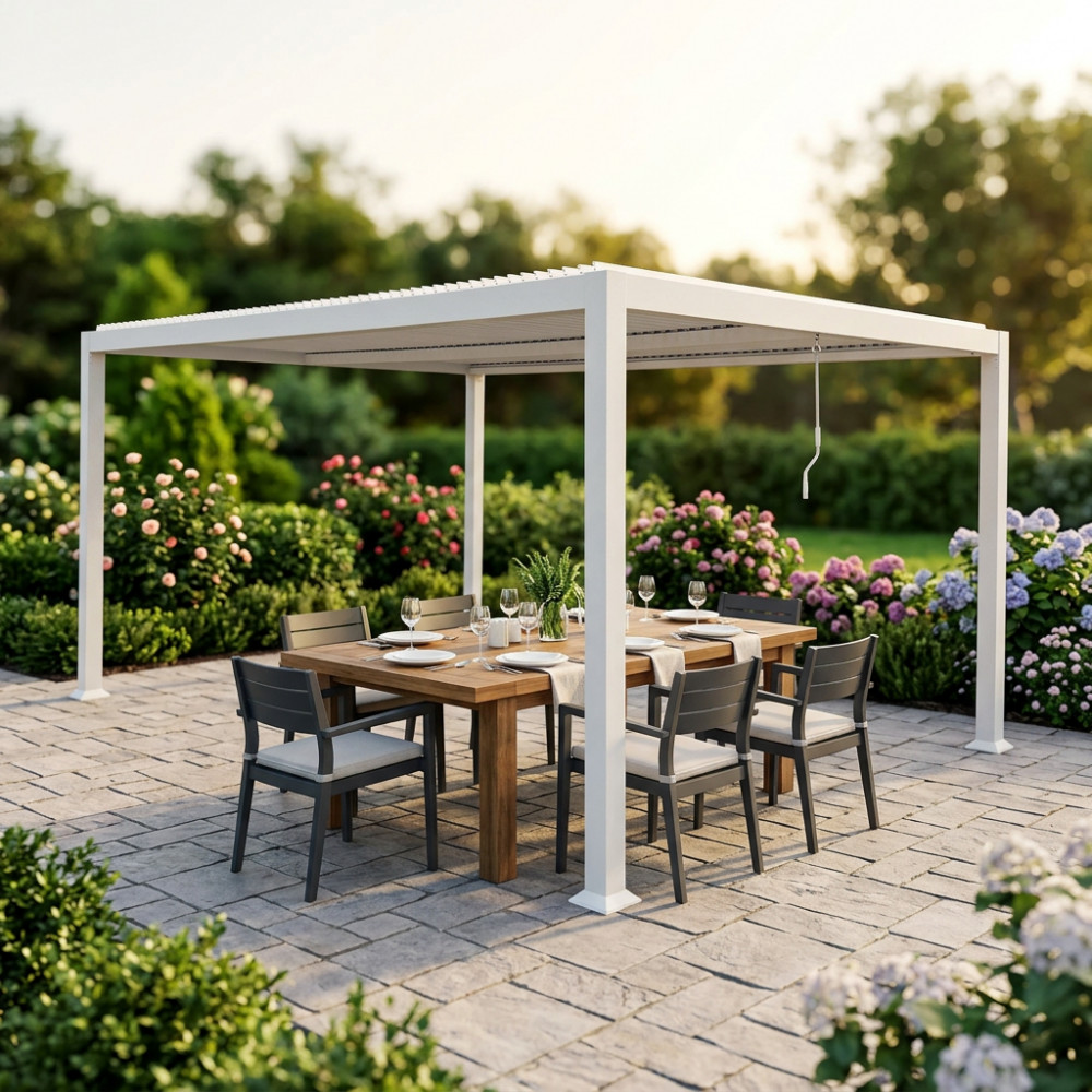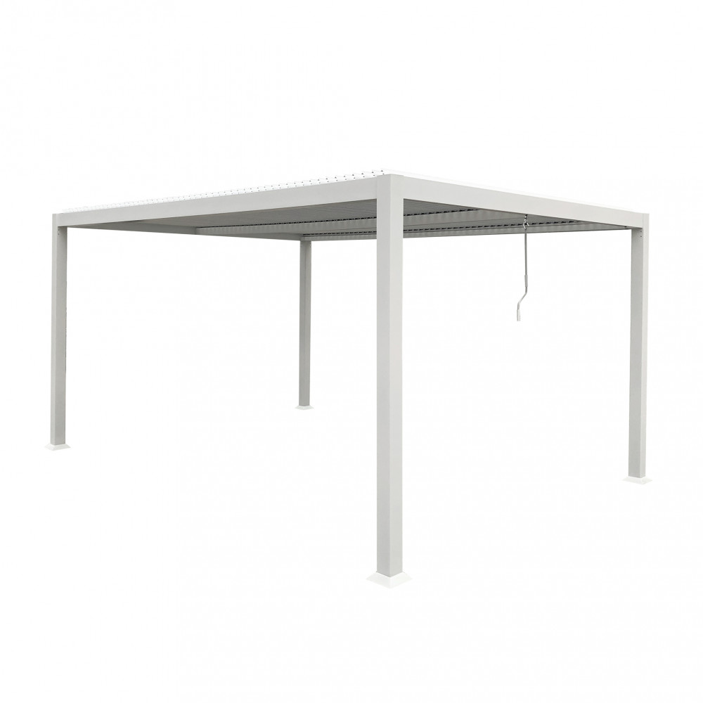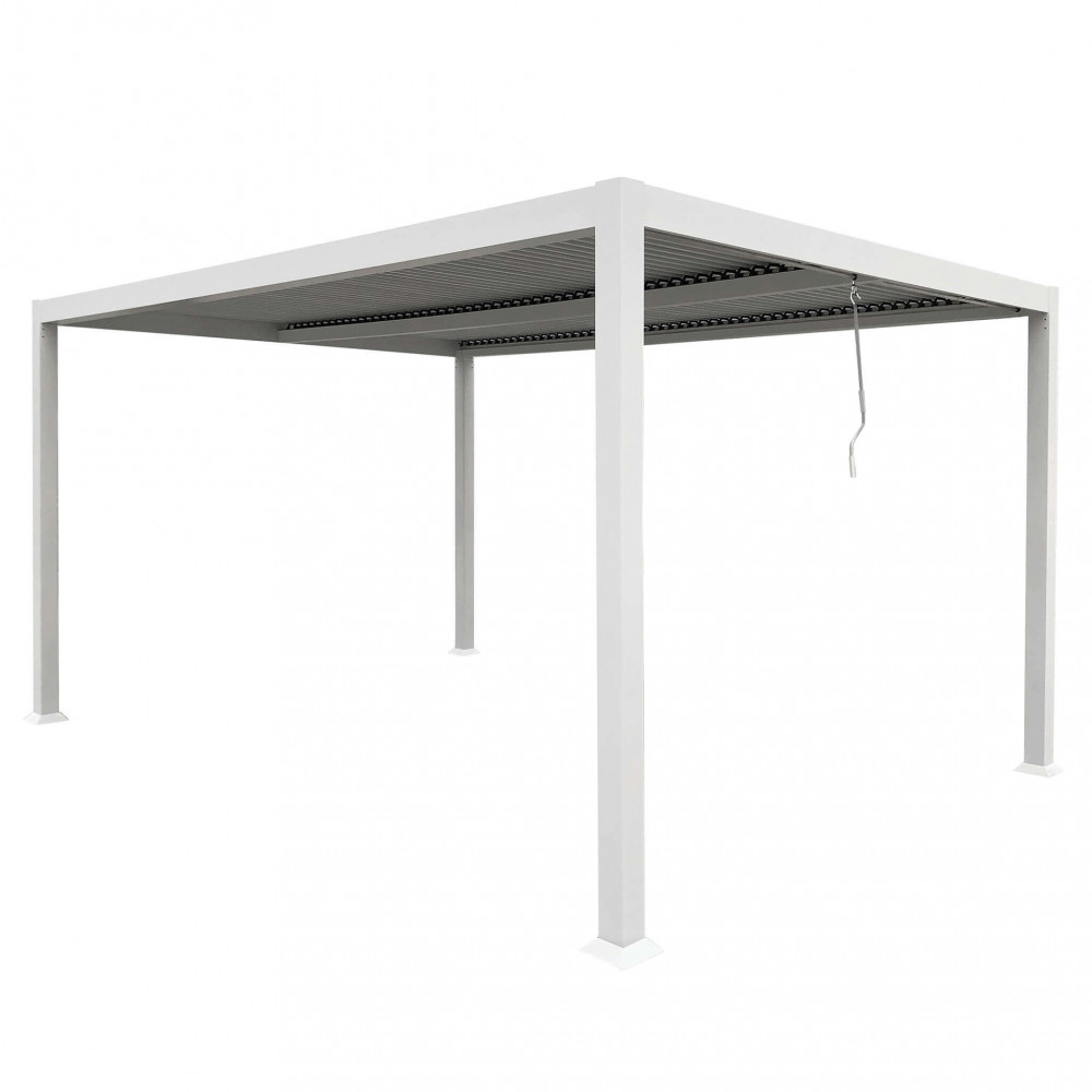 Struttura in alluminio bianco o grigio scuro copertura a lamelle frangisole orientabili a movimentazione manuale resistente a tutte le intemperie Dimensioni: m 3 x 4 x 2,3 h