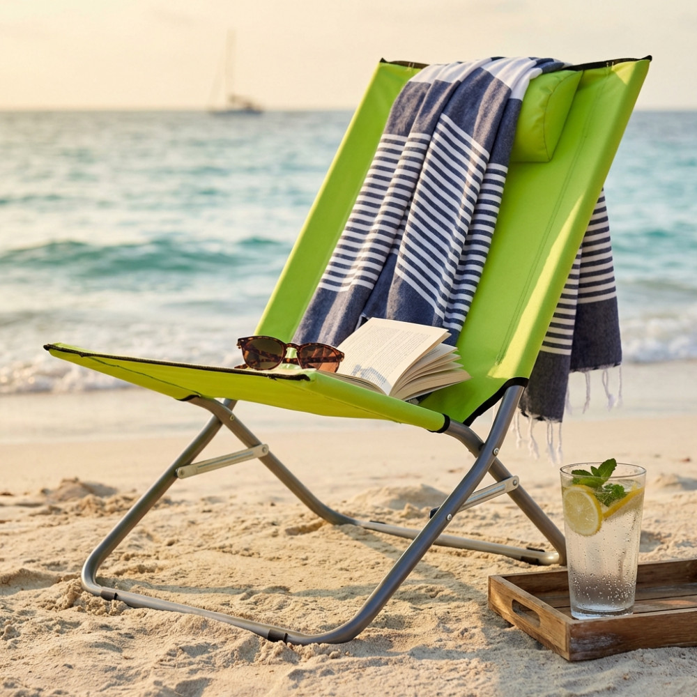 Disponibile BLU, AZZURRO o VERDE LIME struttura in metallo Ø 25 mm, portata max 110 kg tessuto textilene 1 x 1 Dimensioni: cm 76 x 50 x 33/74 h