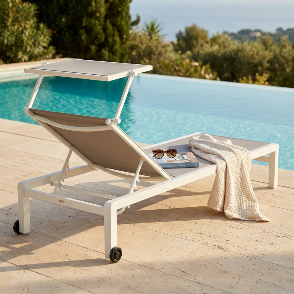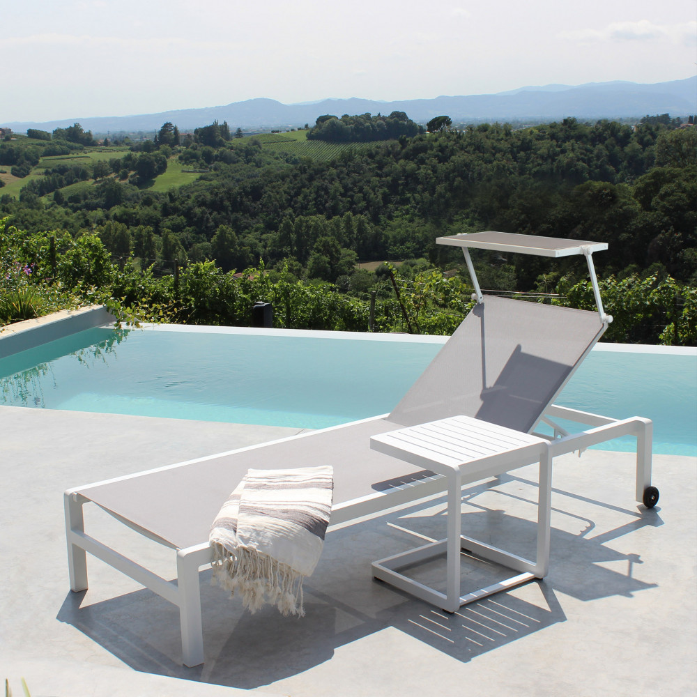 - Dati Tecnici Struttura in alluminio verniciato BIANCO o ANTRACITE o TAUPE textilene 2 x 1 con tettuccio Dimensioni: cm 195 x 78 x 32/54 h