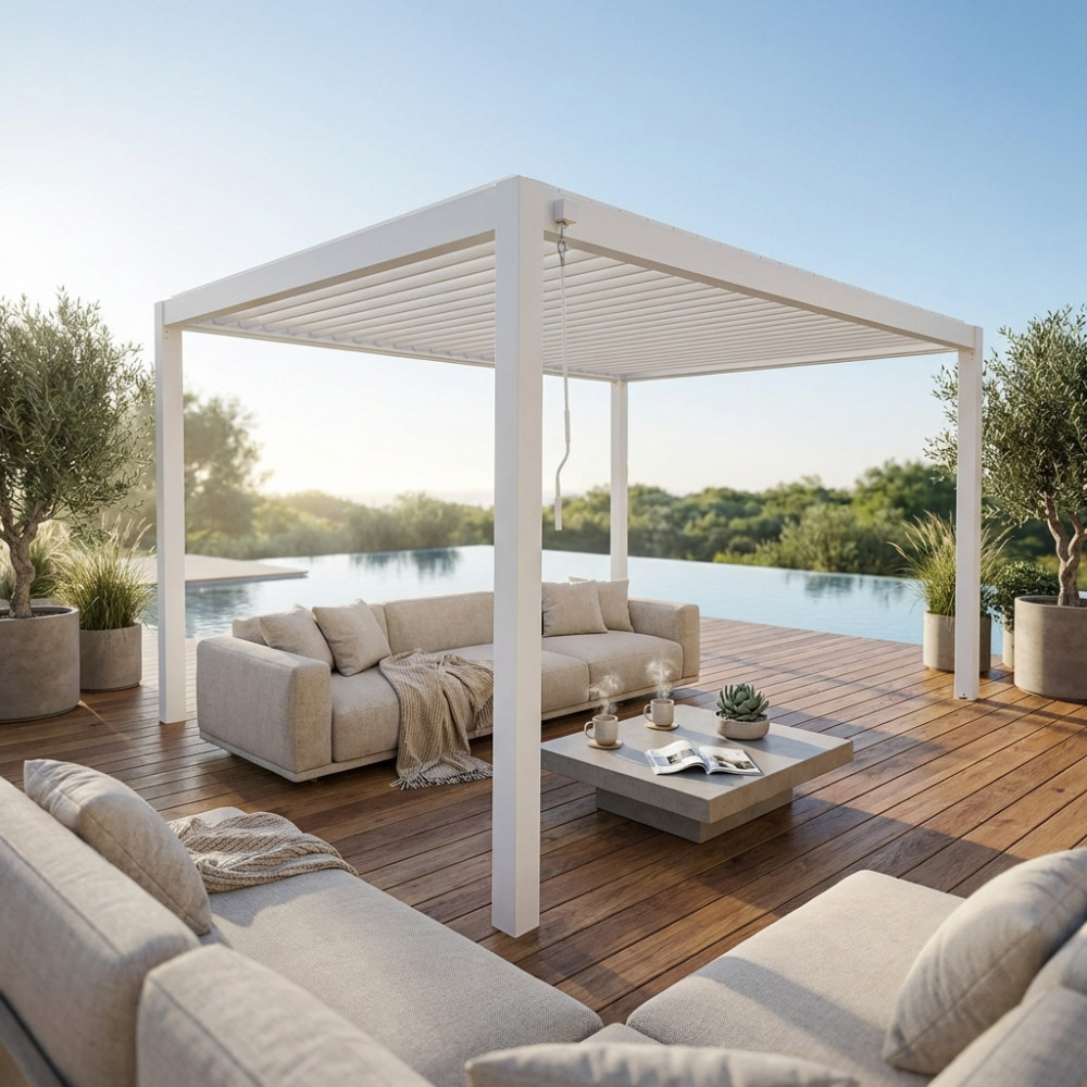 Struttura in alluminio bianco o grigio scuro copertura a lamelle frangisole orientabili a movimentazione manuale resistente a tutte le intemperie Dimensioni: m 3 x 3 x 2,4 h