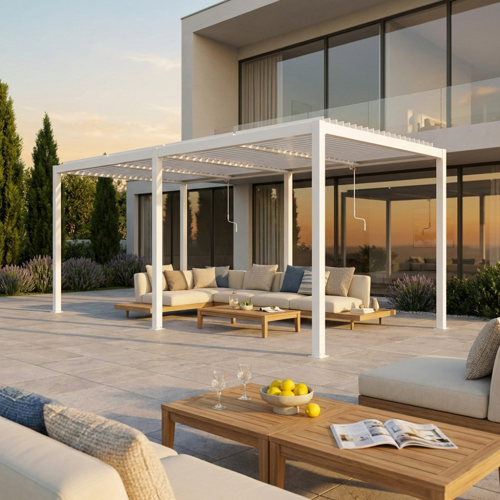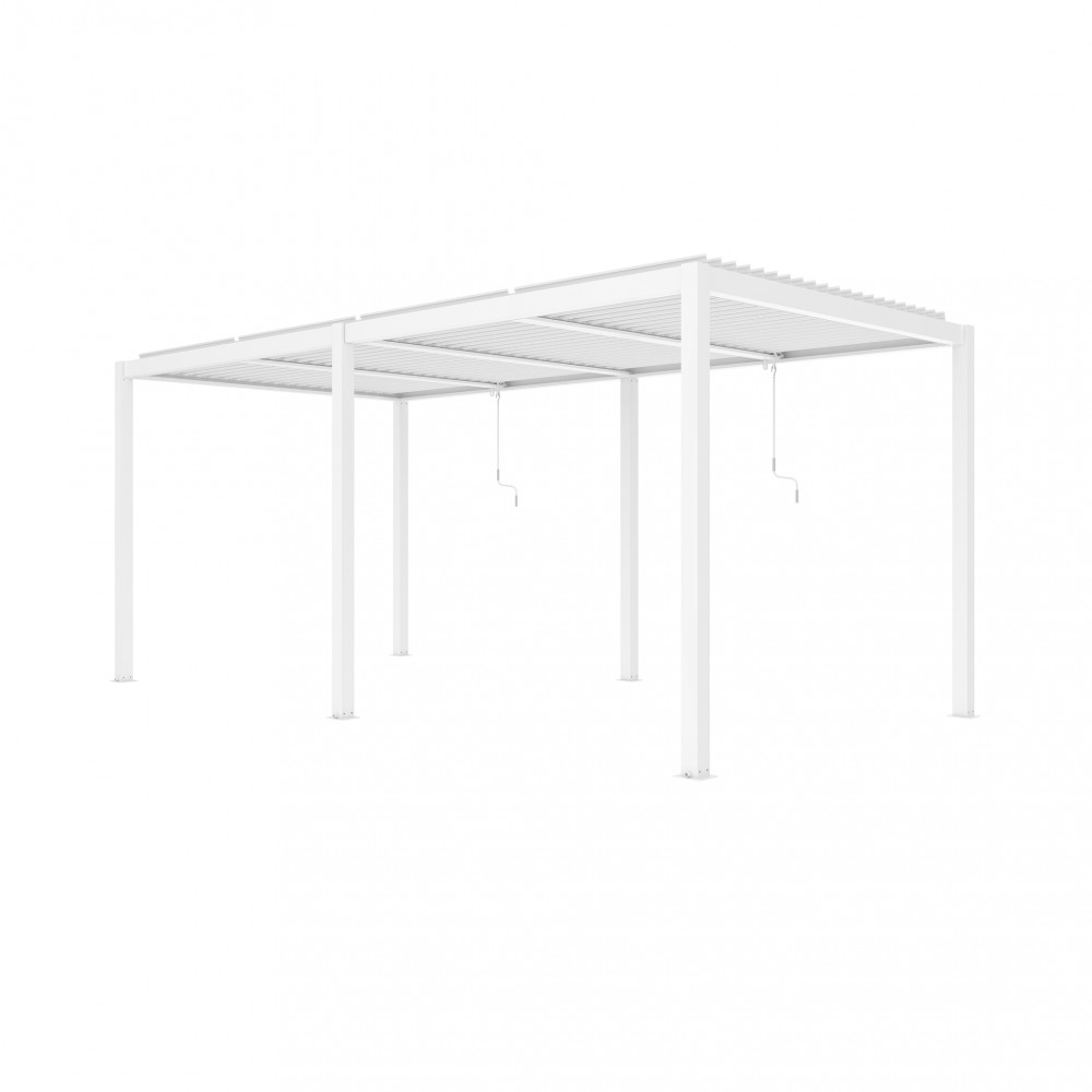 Struttura in alluminio bianco o grigio scuro copertura a lamelle frangisole orientabili a movimentazione manuale resistente a tutte le intemperie Dimensioni: m 5,8 x 3 x 2,5 h