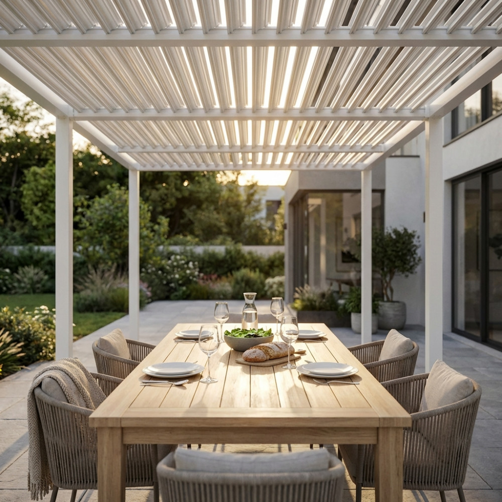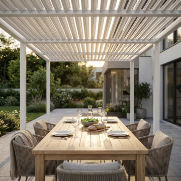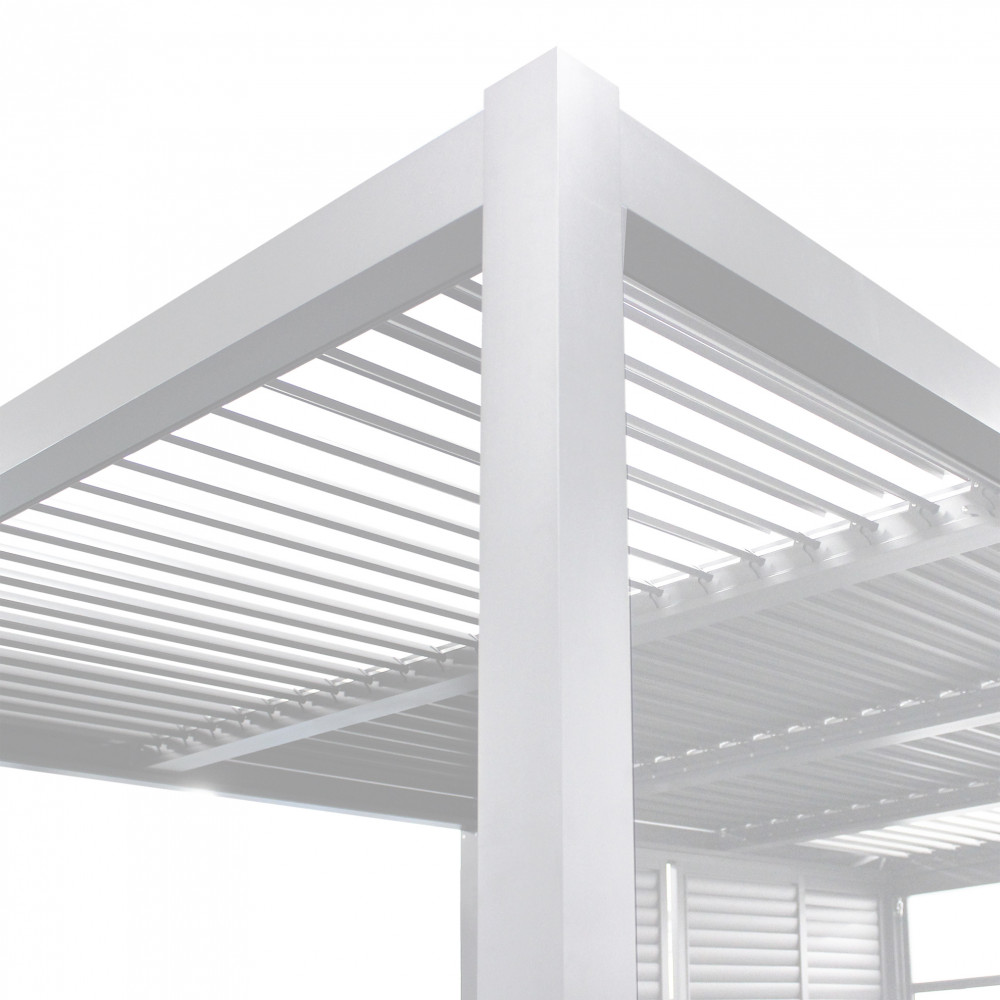 Struttura in alluminio bianco o grigio scuro copertura a lamelle frangisole orientabili a movimentazione manuale resistente a tutte le intemperie Dimensioni: m 7,8 x 4 x 2,5 h