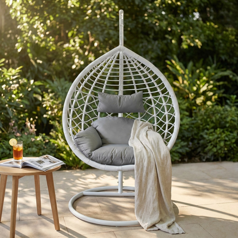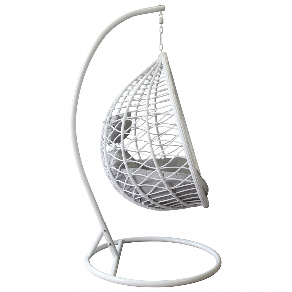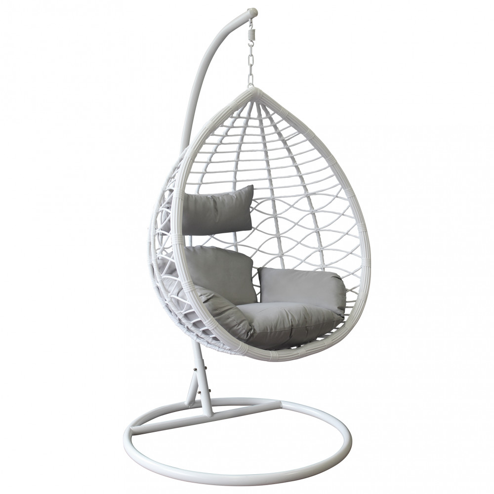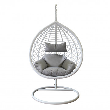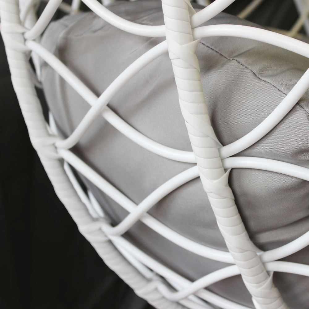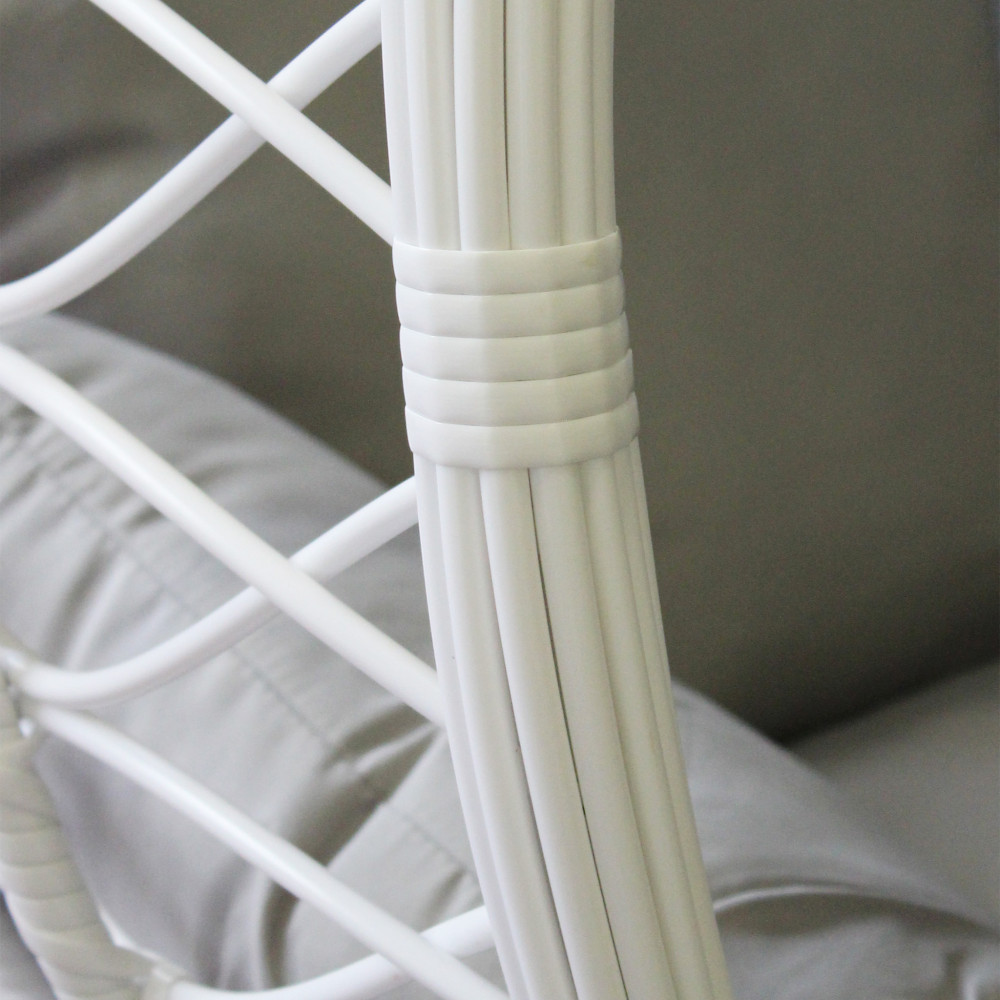 Struttura in metallo tortora opaco seduta in wicker GRIGIO o BIANCO o NATURALE tubi in metallo 42 x 2,5 mm base 42 x1,5 mm cuscino poliestere in tinta Dimensioni: Struttura Ø 105 x 195h seduta 105 x 71 x 120