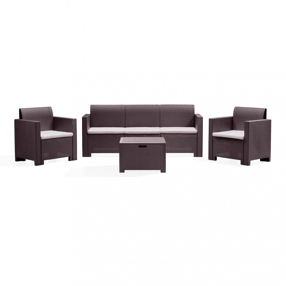 Struttura in plastica stampata, wicker bianco, nero, marrone Dimensioni: Divano 188x57,5x79 cm Poltrona 75x57,5x79 cm Tavolino 69,5x48x37 cm