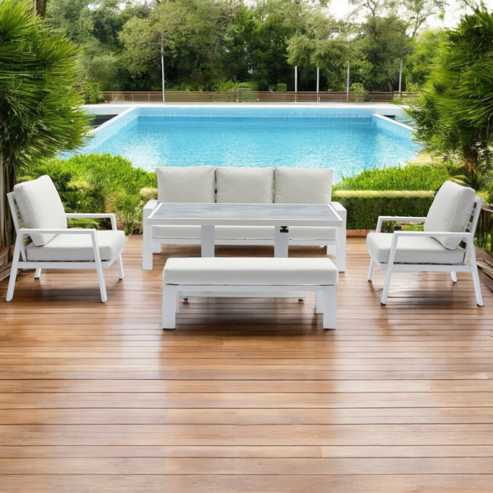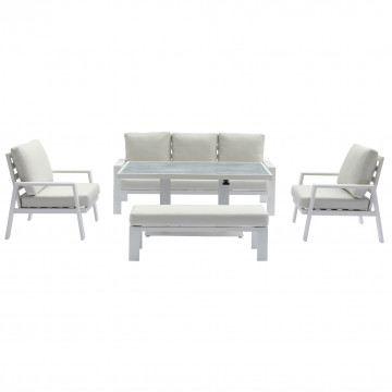 Struttura in alluminio verniciato antracite o bianco tavolo regolabile in altezza con pistone Dimensioni: Divano: 190x 80 x 84 Poltrona: 88 x 80 x 84 Tavolino: 120 x 40 x 42