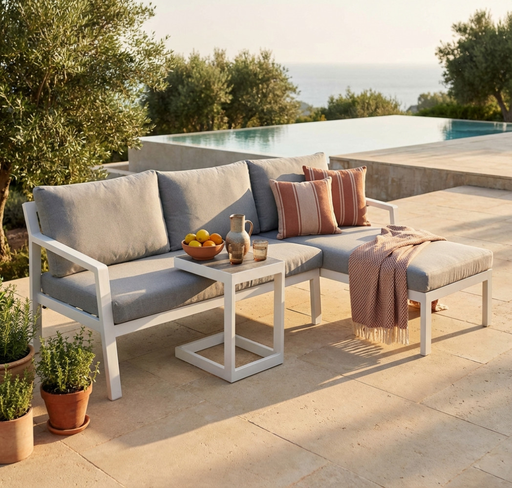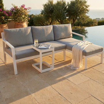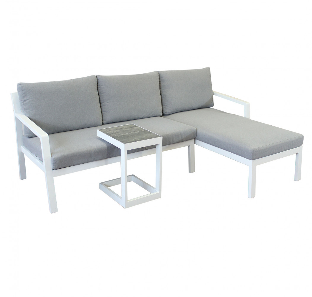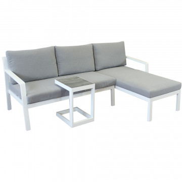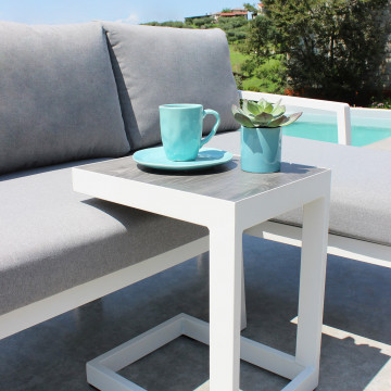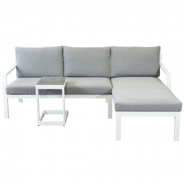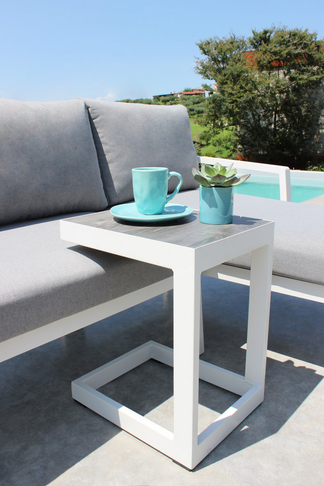Struttura in alluminio verniciato antracite o bianco Dimensioni: Divano: cm 70/135x75/140x75 h Tavolino: cm 32x40x53 h
