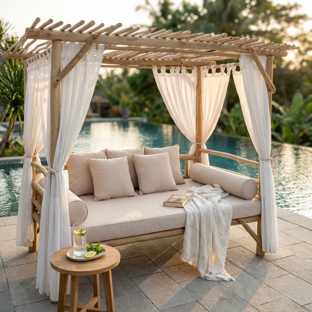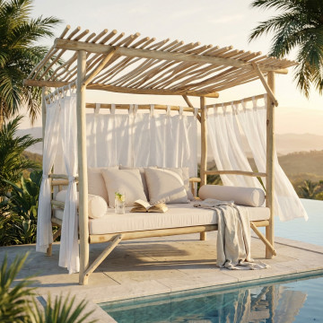 Gazebo letto in teak con cuscini 12 cm e 10 cm Dimensioni: cm 250 l x 180 p x 204 h