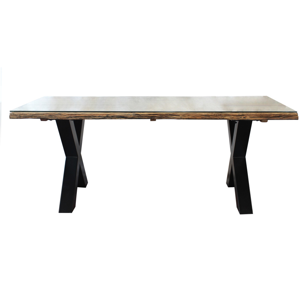 Tavolo con piano in legno ferroviario riciclato e vetro temperato struttura in metallo Dimensioni: cm 100 l x 200 p x 77 h