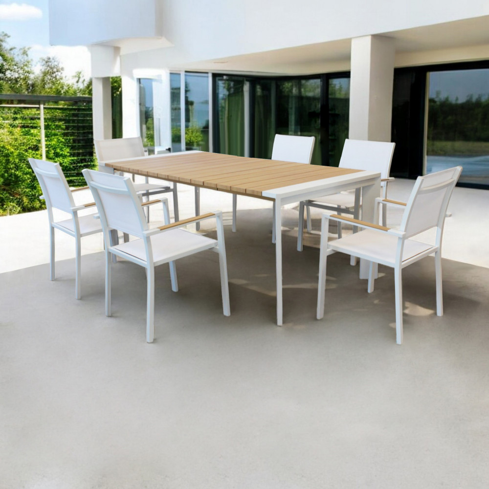 Struttura in alluminio verniciato bianco o antracite piano del tavolo effetto legno Dimensioni: cm 150/200 l x 100 p x 75 h
