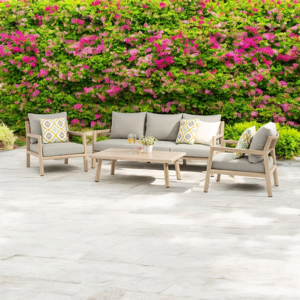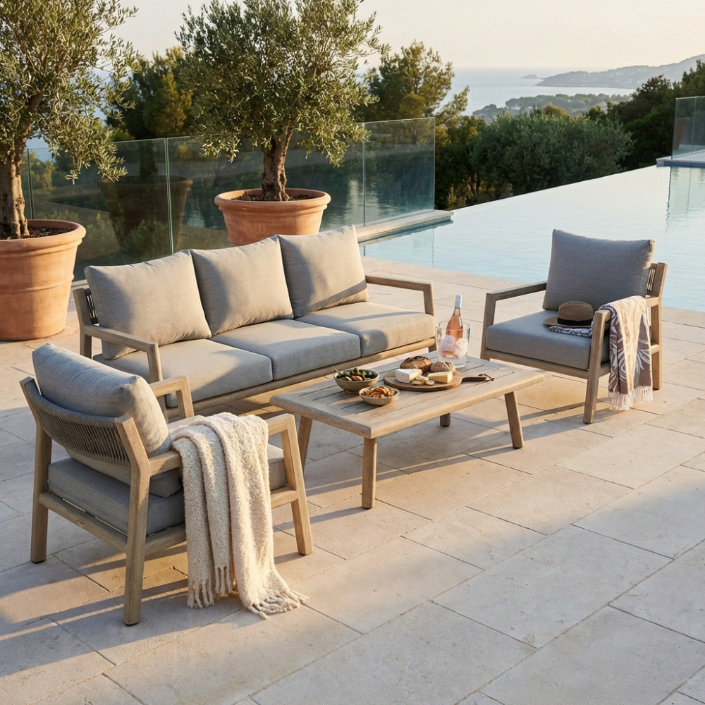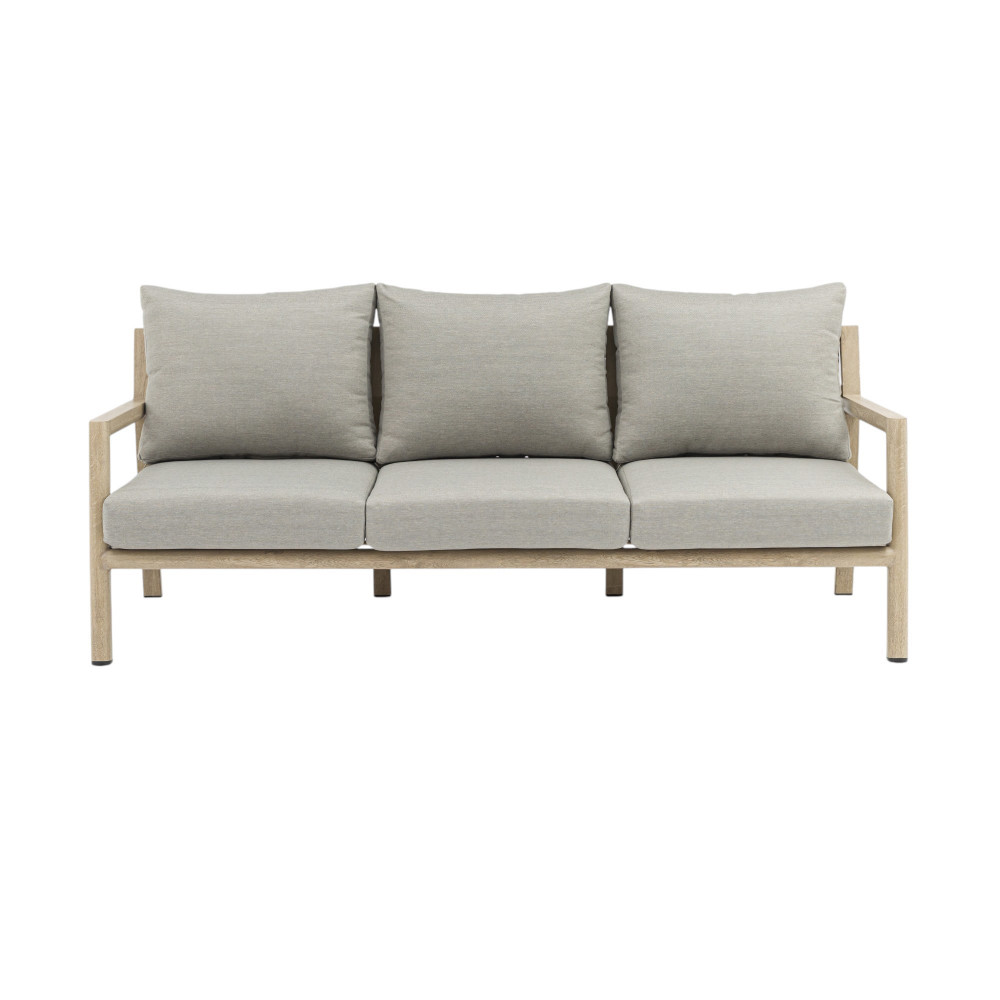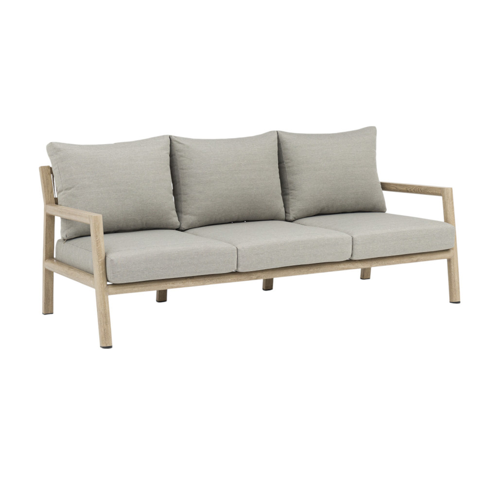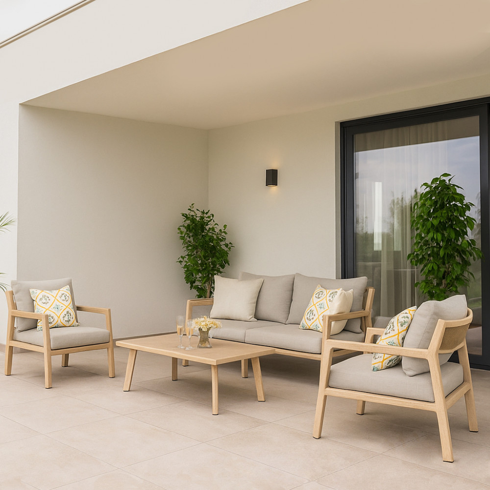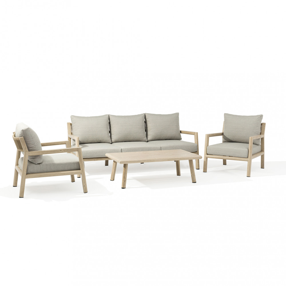 Struttura in alluminio verniciato naturale con cuscini Dimensioni: Poltrona: cm 88x88x71,5 Tavolino: cm 120x68,5x39 Divano: cm 200x88,5x75