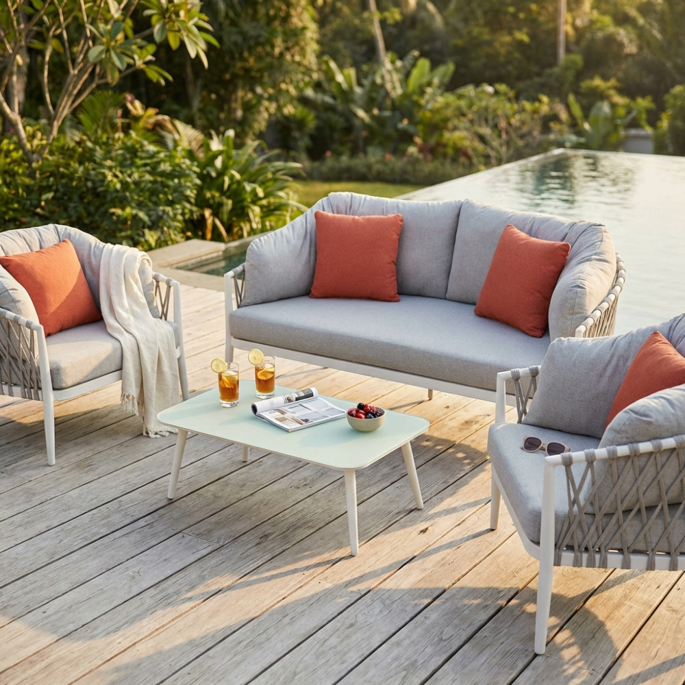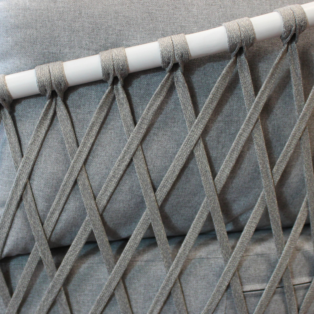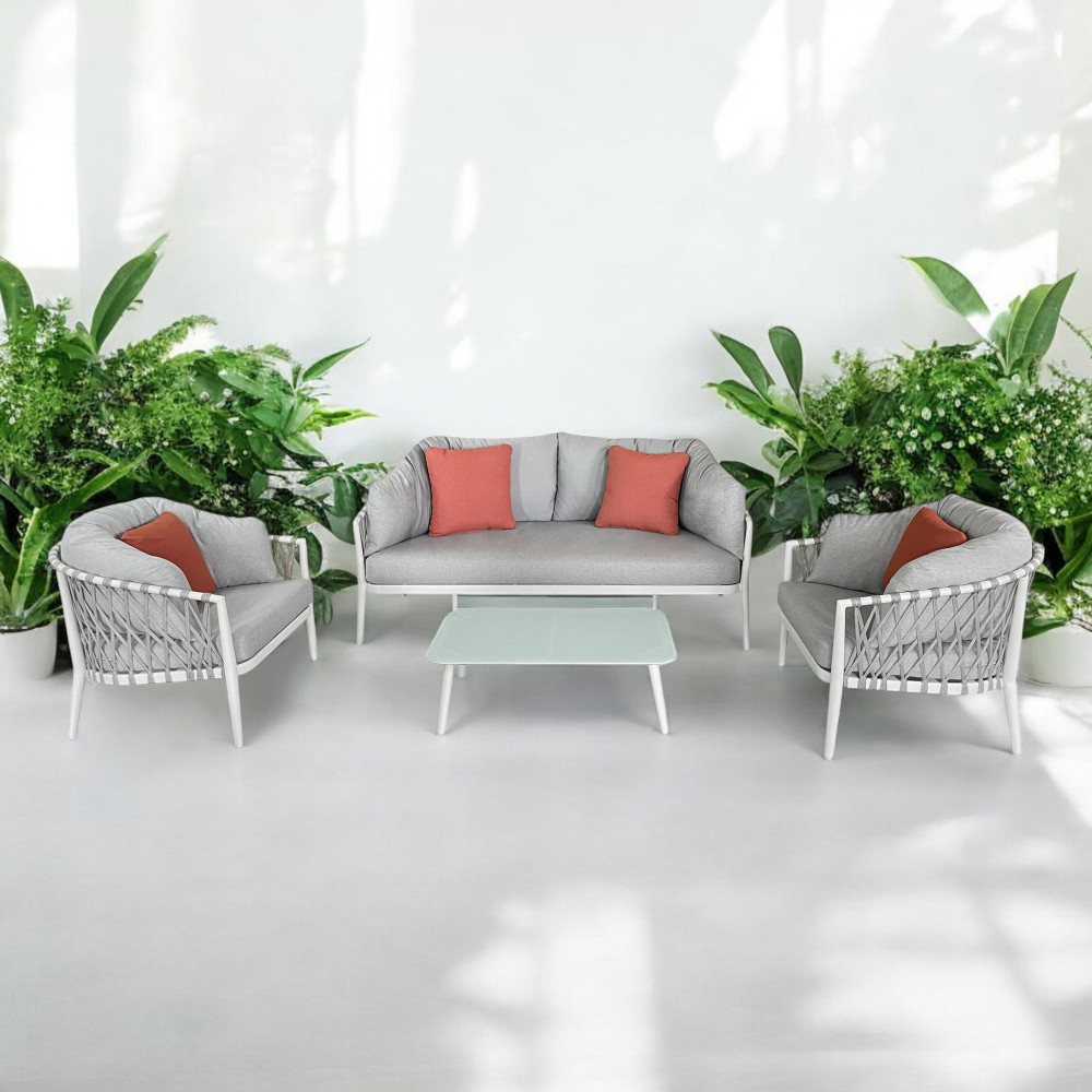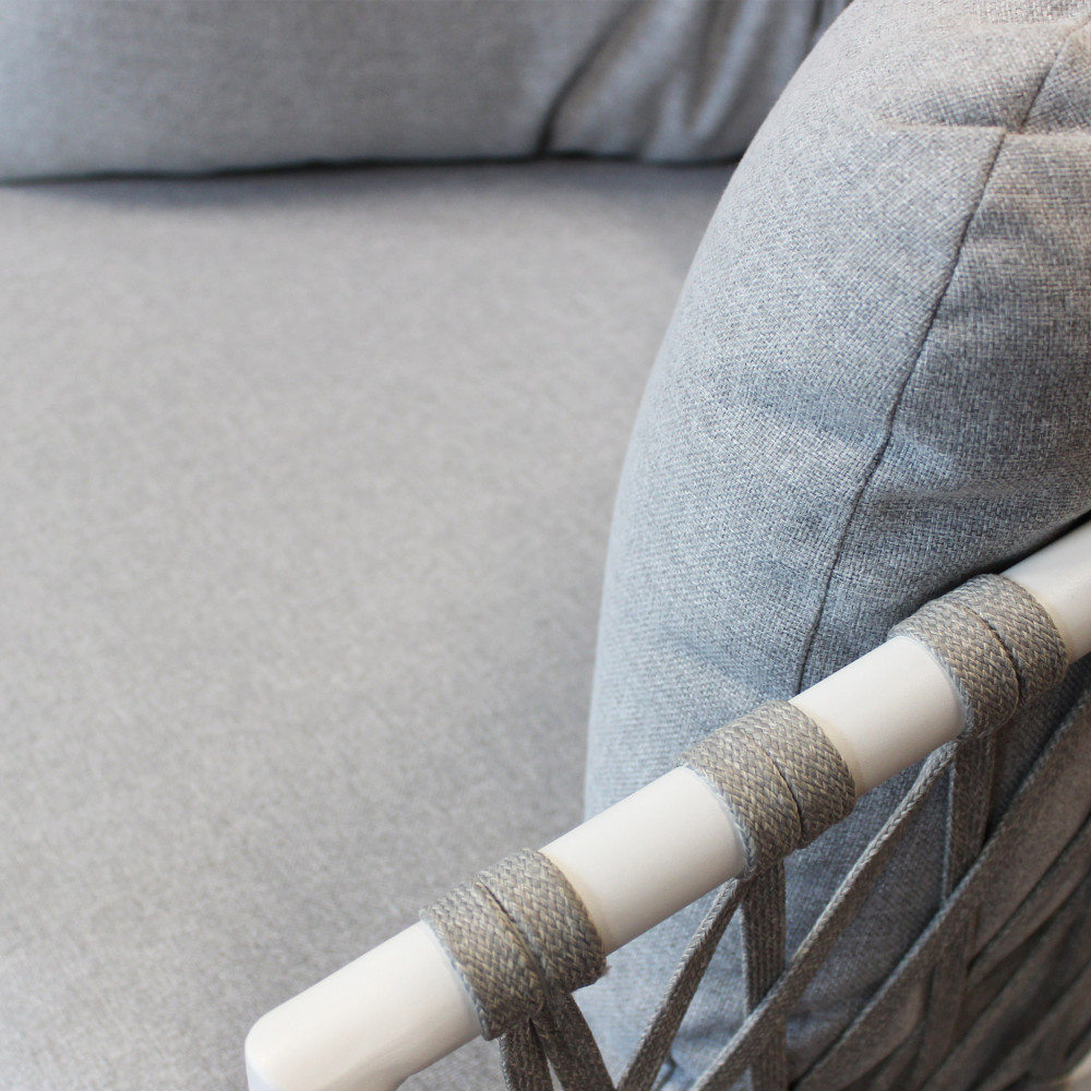 Struttura in alluminio verniciato taupe o bianca rivestimento in corda in pvc Dimensioni: Divano: cm 175x86x75 Poltrona: cm 85x86x75 Tavolino: cm 100x60x30