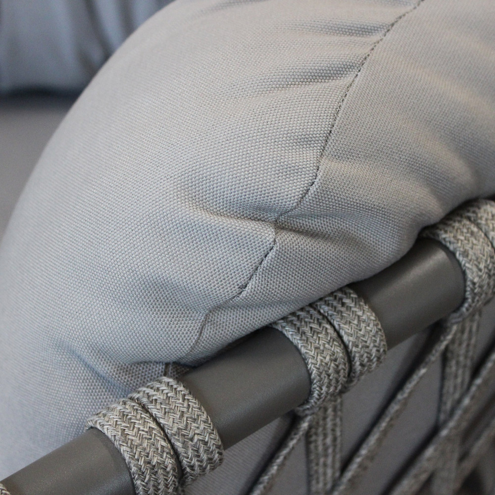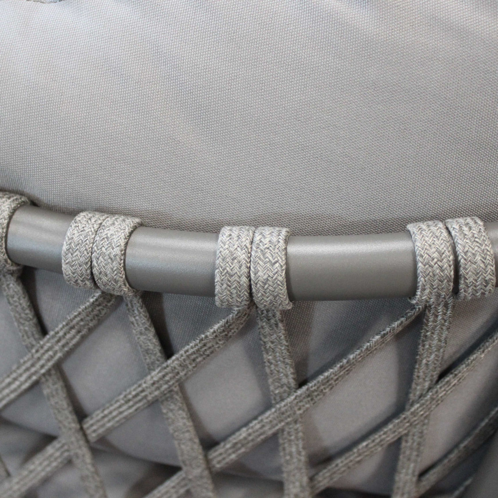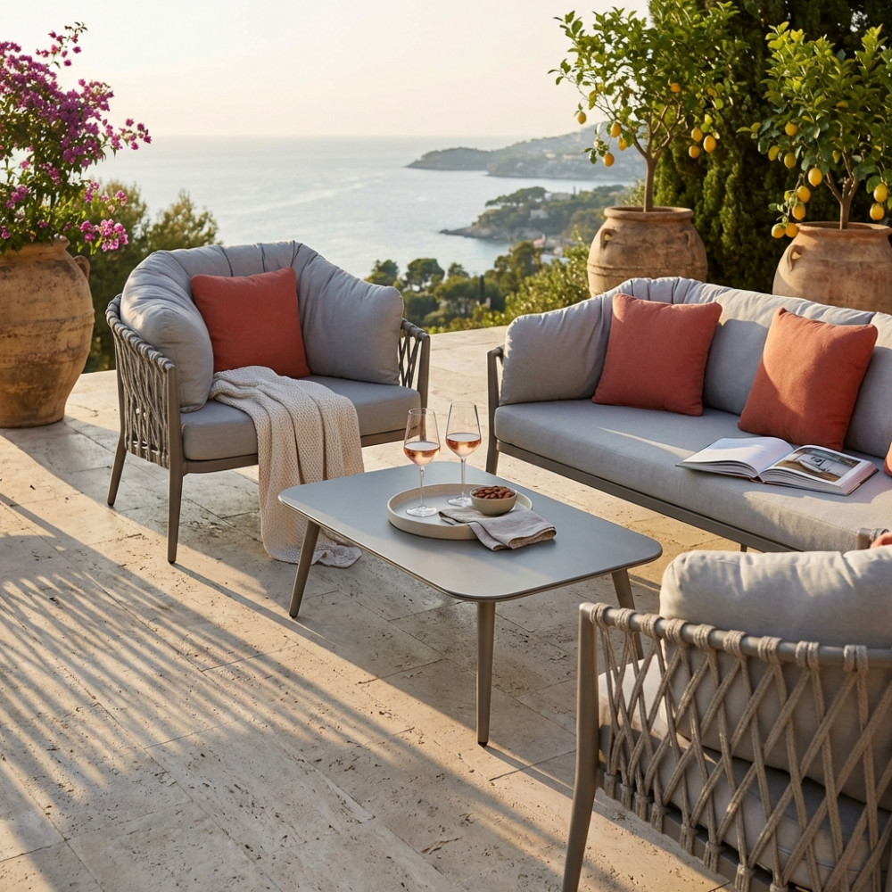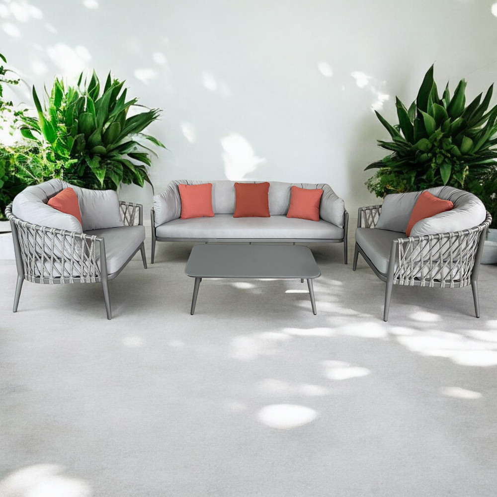 Struttura in alluminio verniciato taupe o bianca rivestimento in corda in pvc Dimensioni: Divano: cm 210x86x75 Poltrona: cm 85x86x75 Tavolino: cm 100x60x30