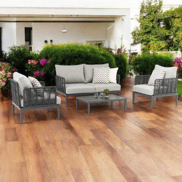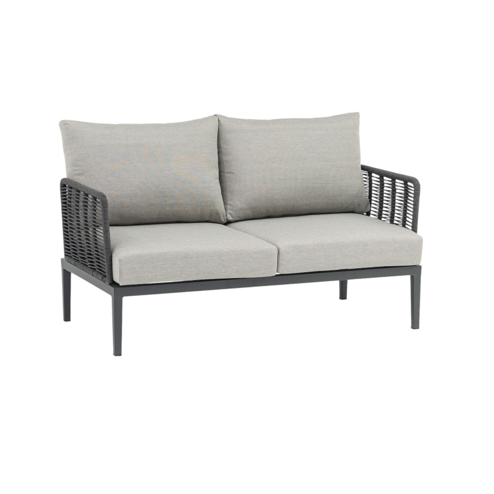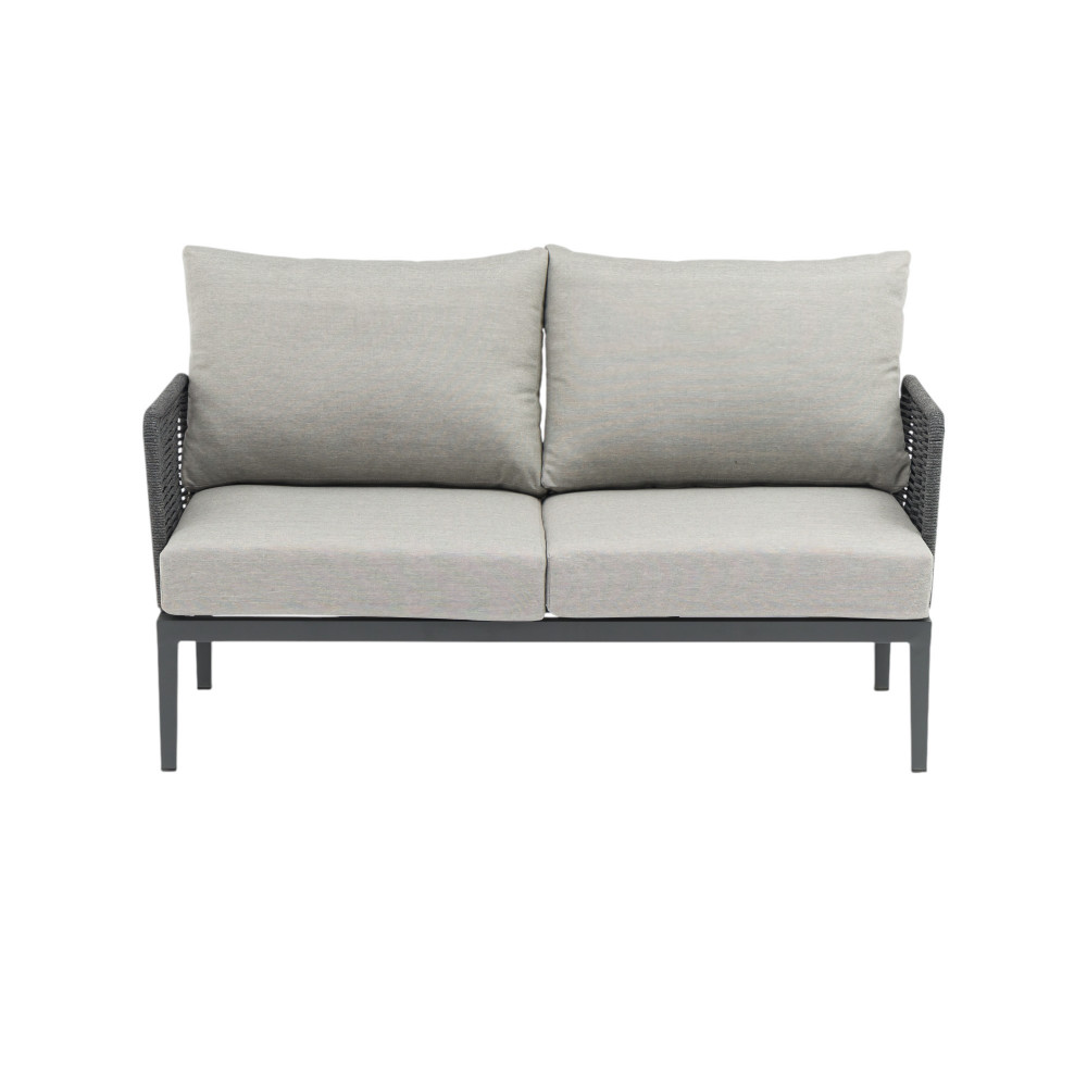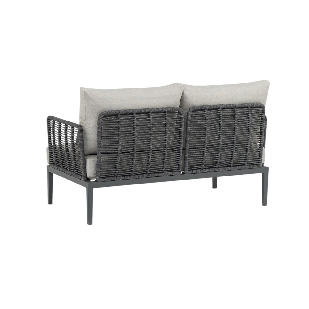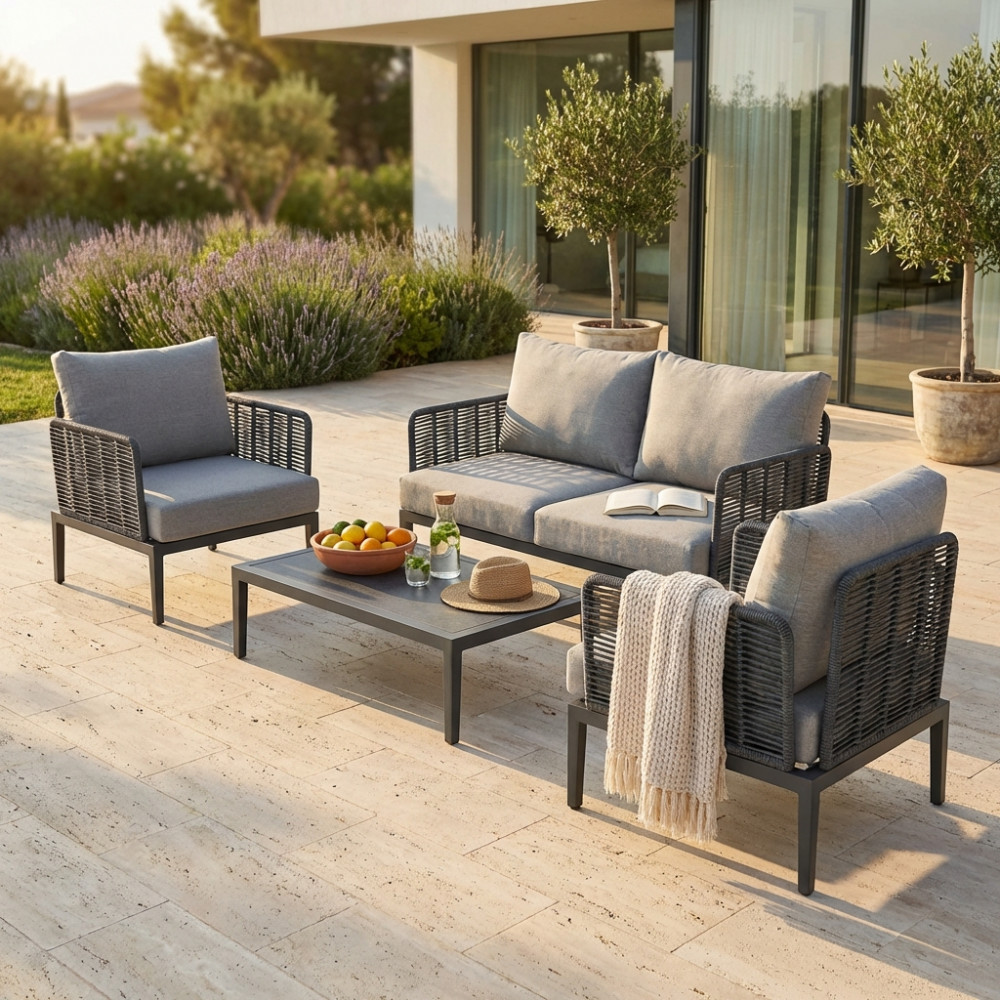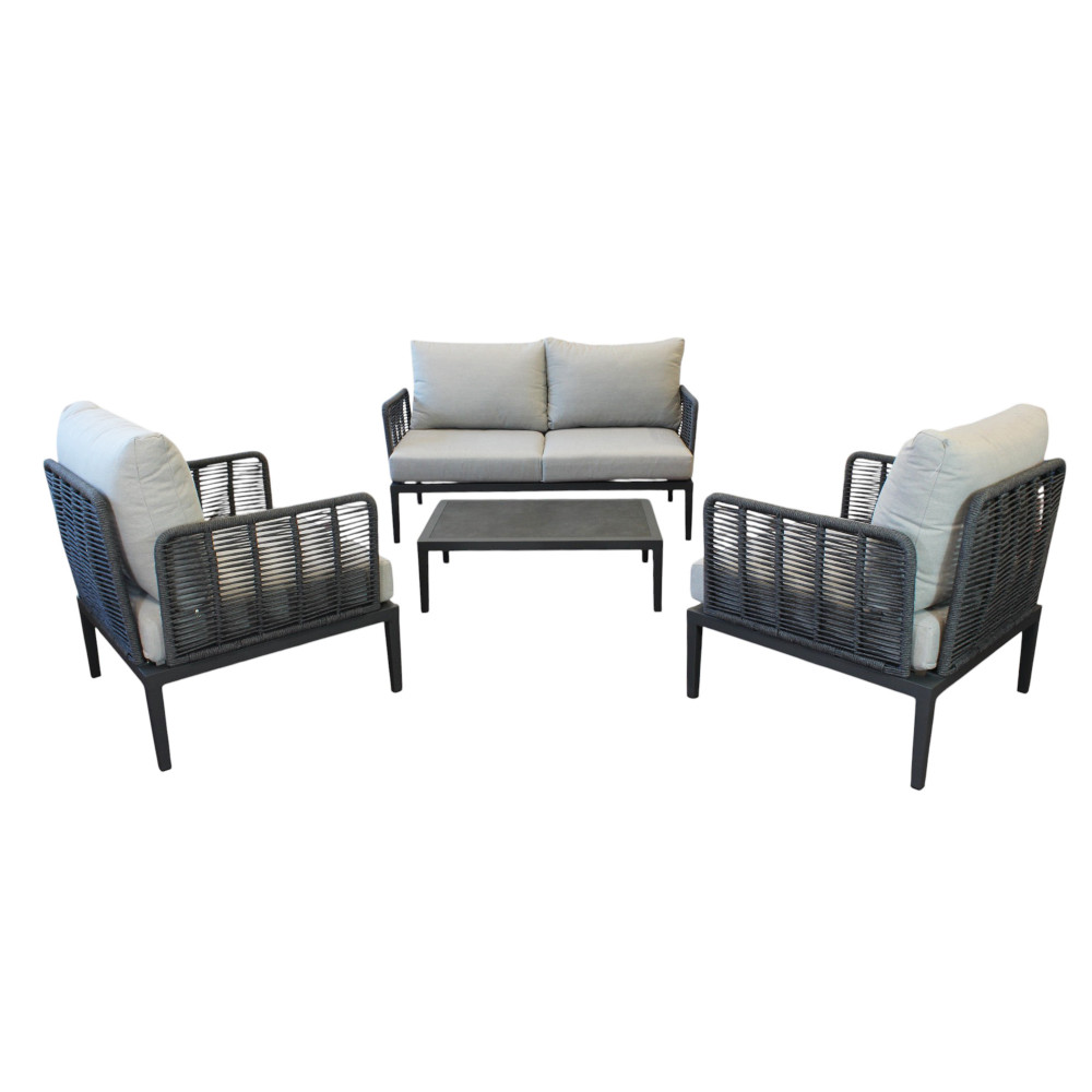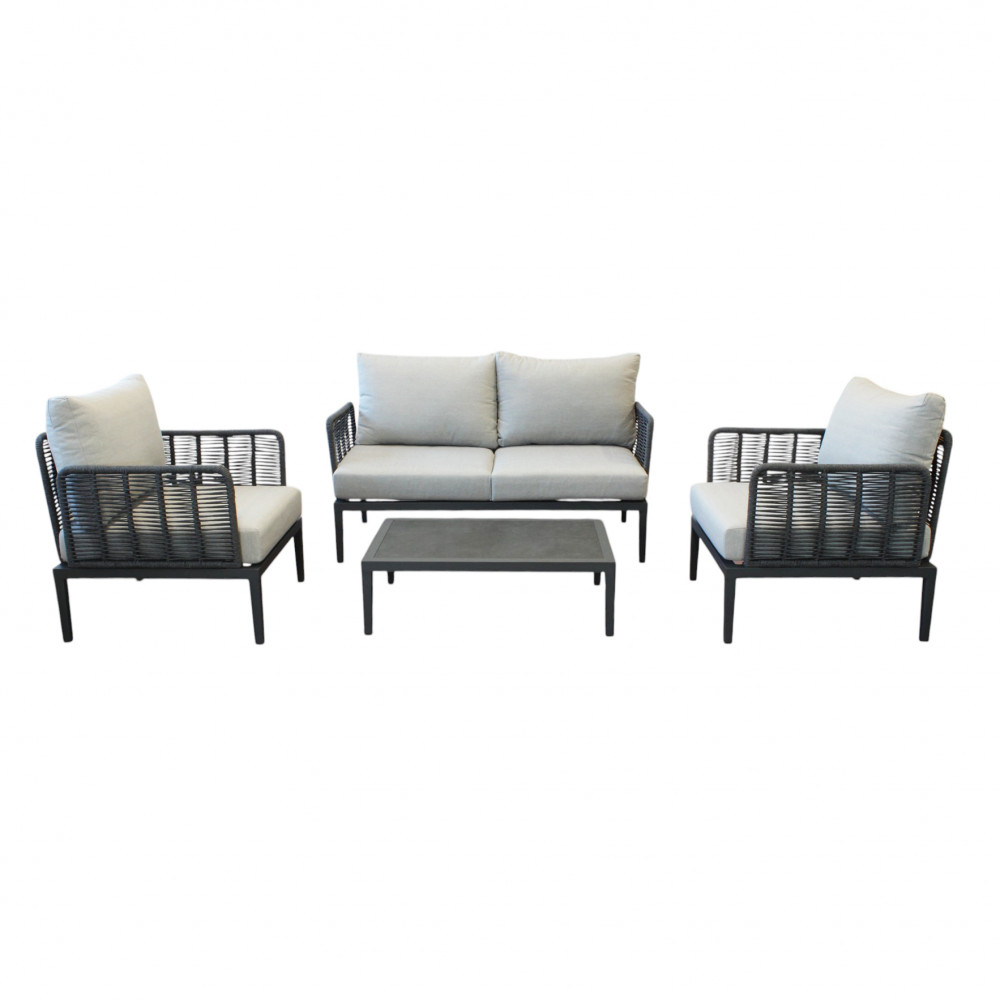 Struttura in alluminio verniciato antracite rivestimento in corda in pvc con cuscini Dimensioni: Poltrona: cm 81x80x75 Tavolino: cm 90x62x27,5 Divano: cm 166x80x75