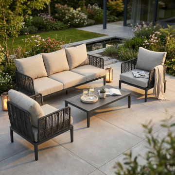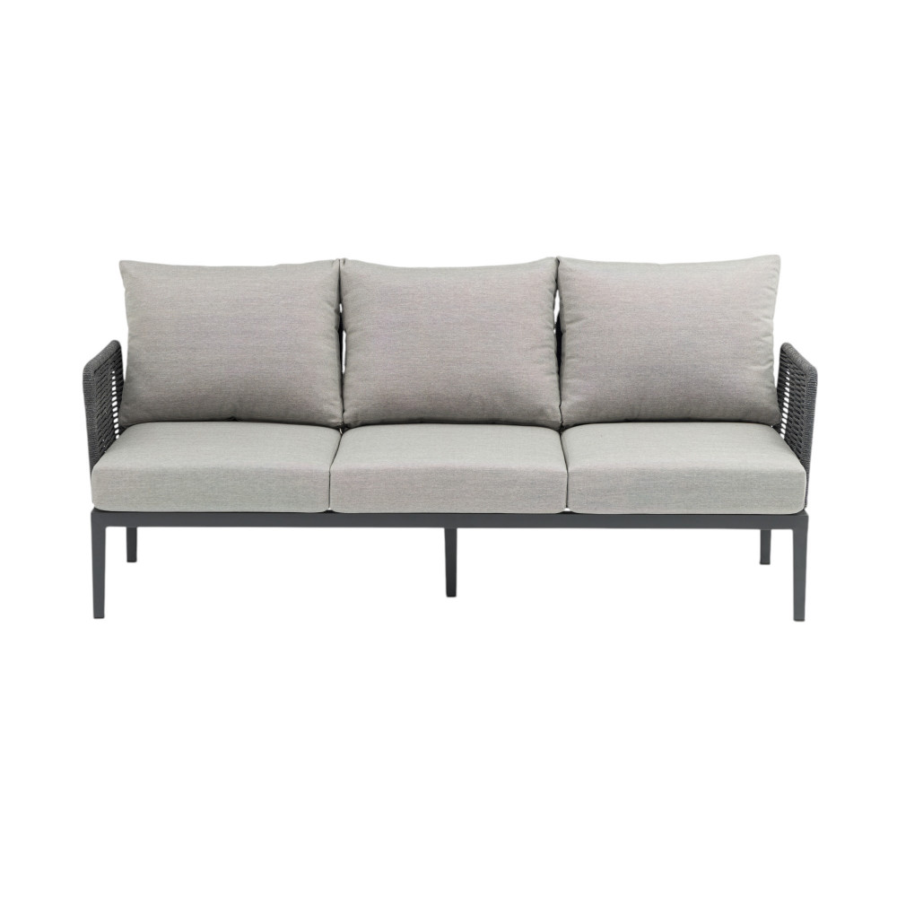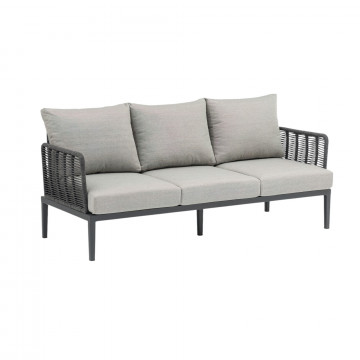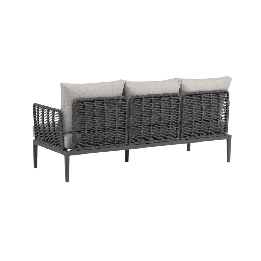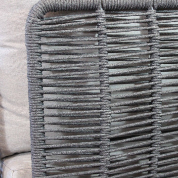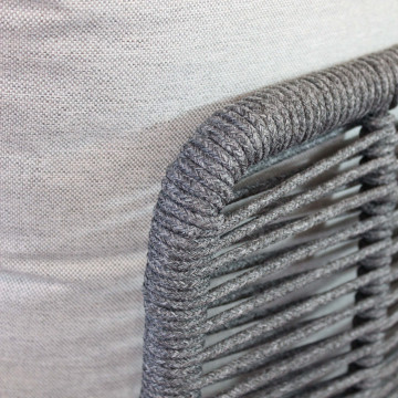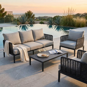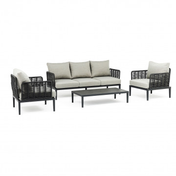 Struttura in alluminio verniciato antracite rivestimento in corda in pvc con cuscini Dimensioni: Poltrona: cm 81x80x75 Tavolino: cm 90x62x27,5 Divano: cm 191x80x75