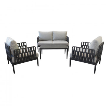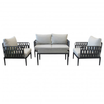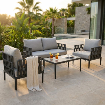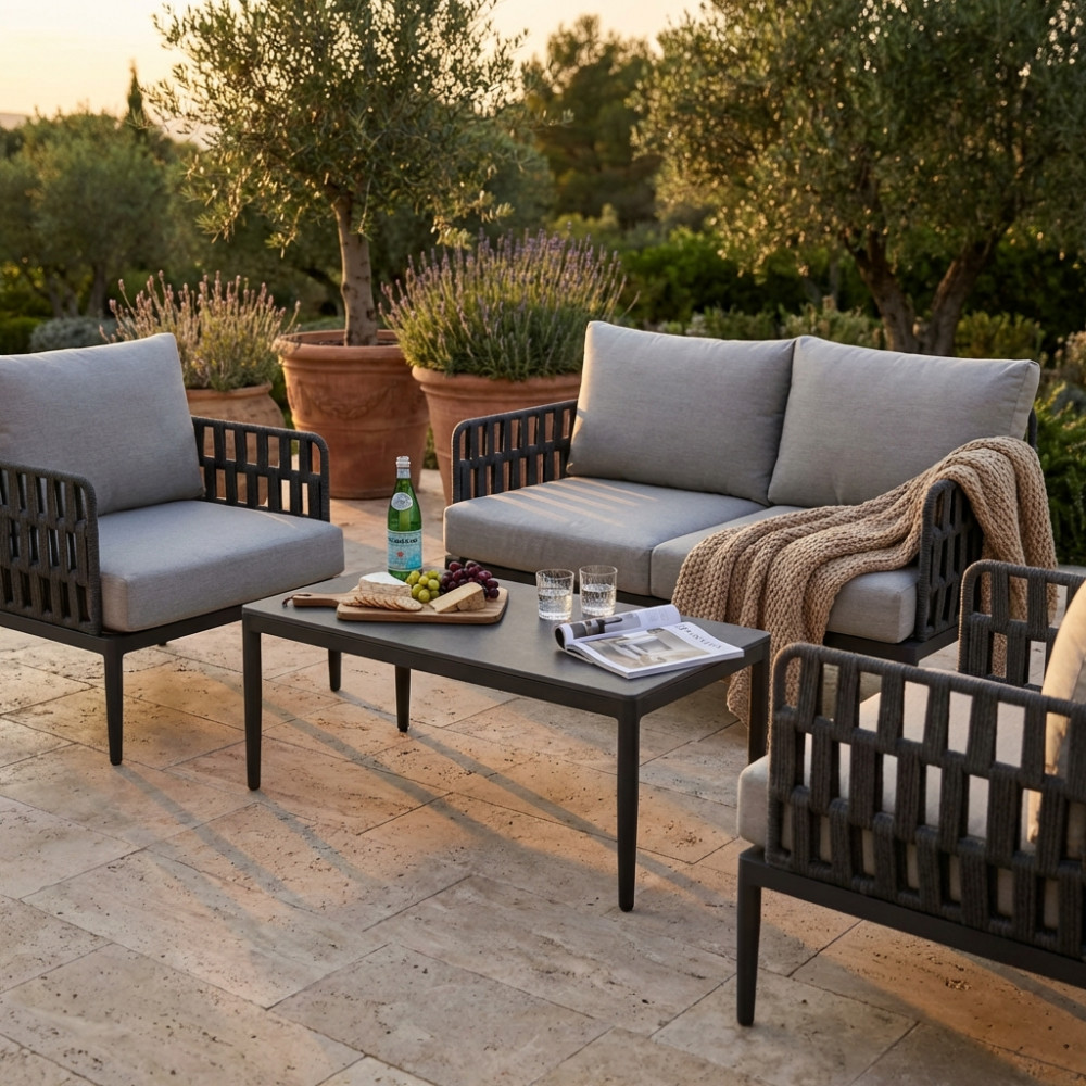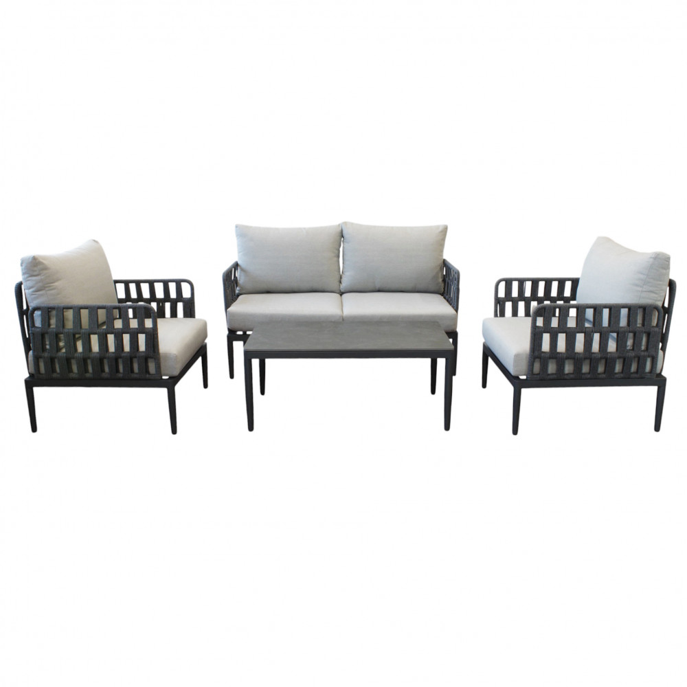 Struttura in alluminio grigio chiaro, naturale o antracite rivestimento in corda in pvc con cuscini Dimensioni: Poltrona: cm 81x80x75 Tavolino: cm 120x60x42 Divano: cm 147x80x75