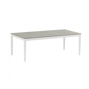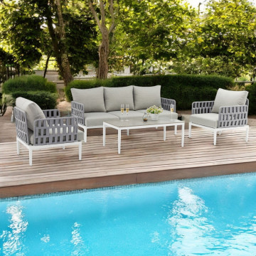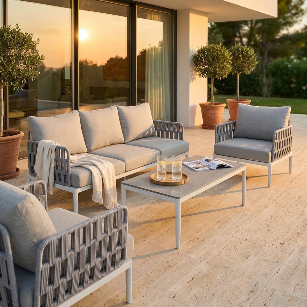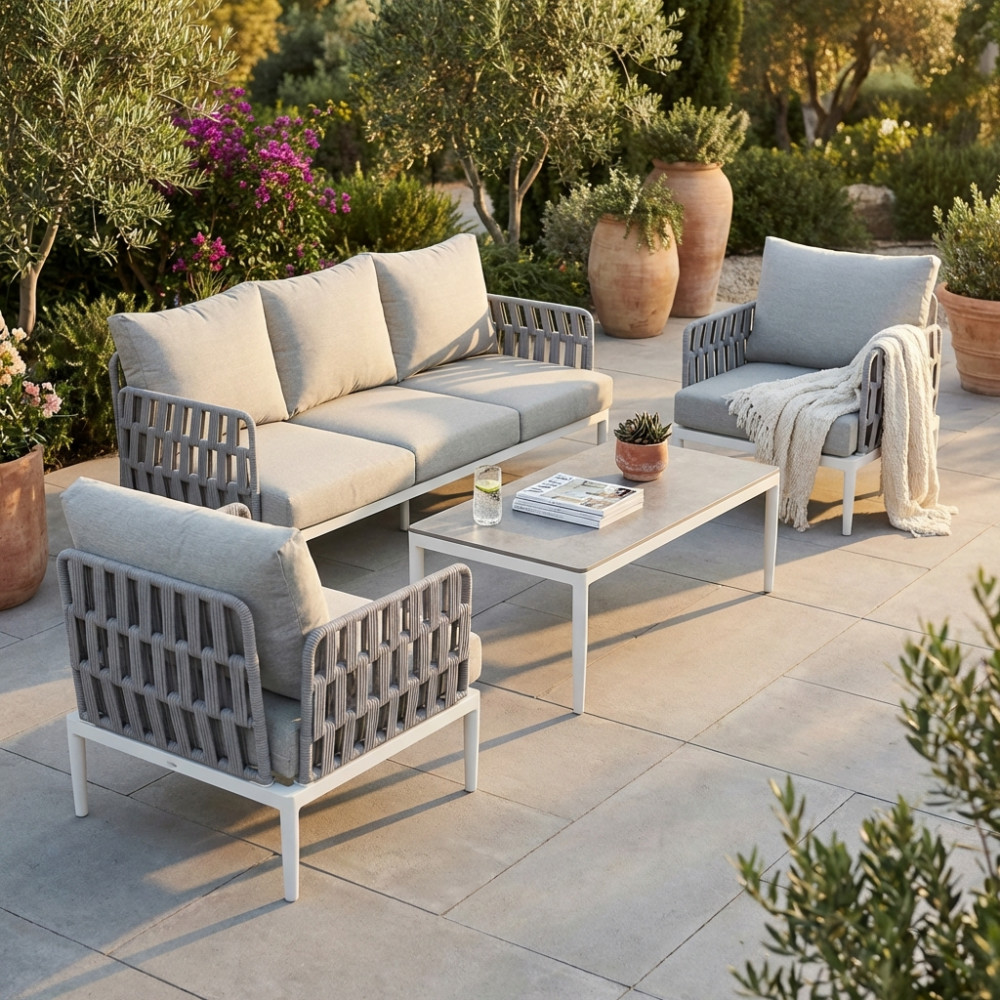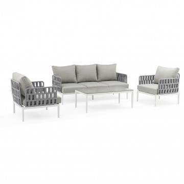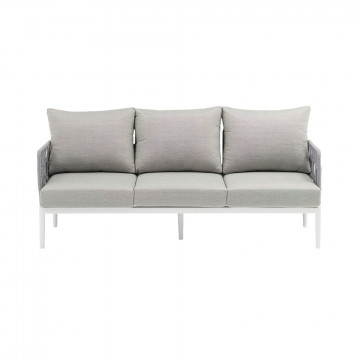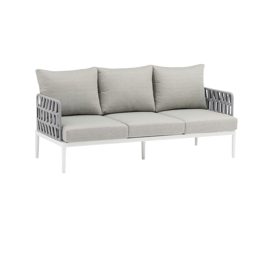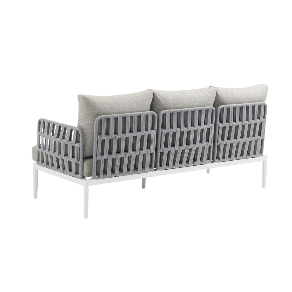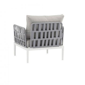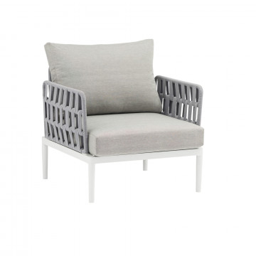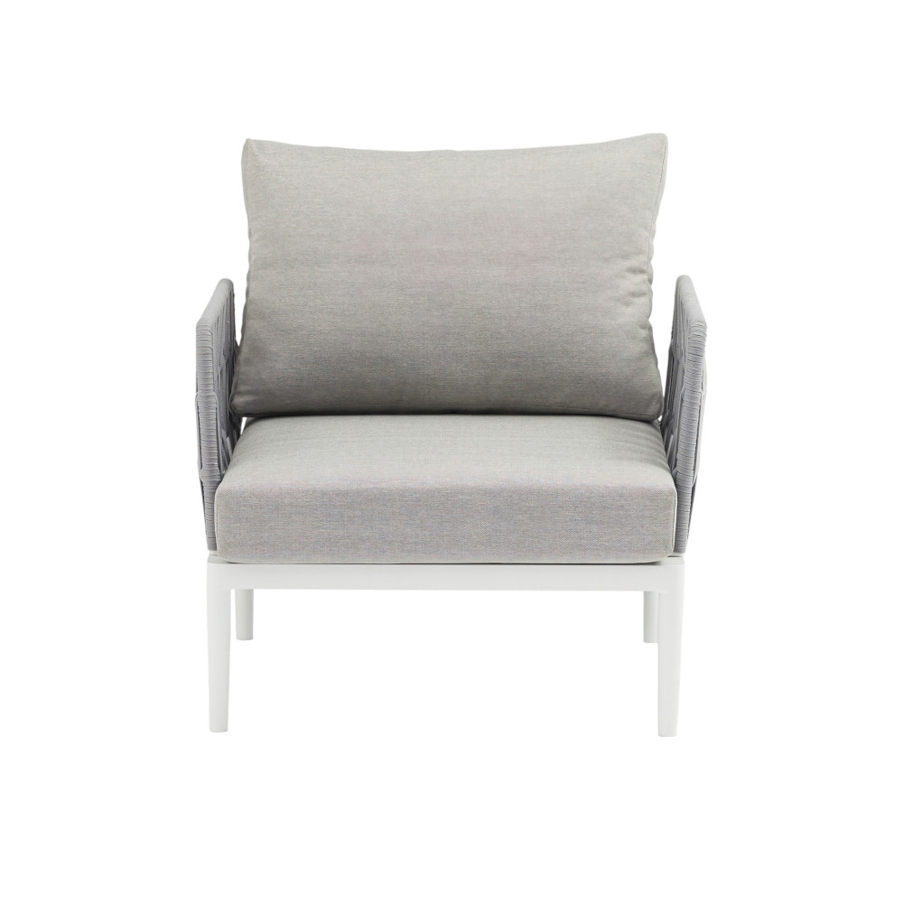 Struttura in alluminio grigio chiaro, naturale o antracite rivestimento in corda in pvc con cuscini Dimensioni: Poltrona: cm 81x80x75 Tavolino: cm 120x60x42 Divano: cm 191x80x75