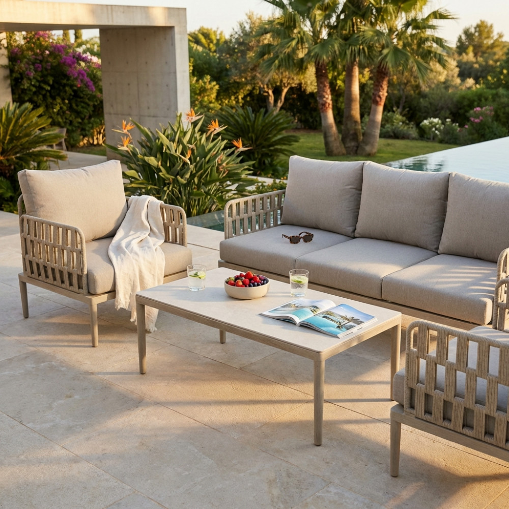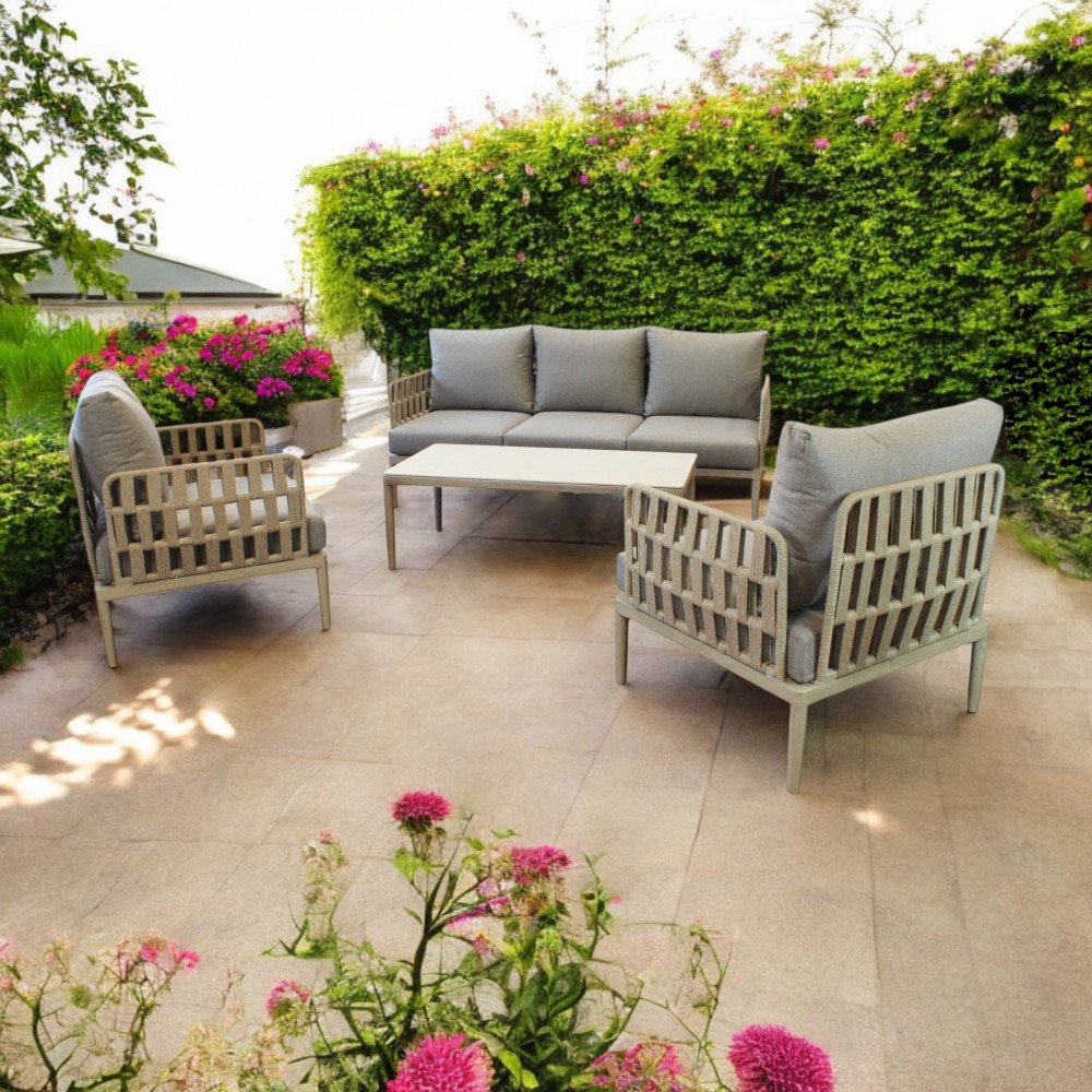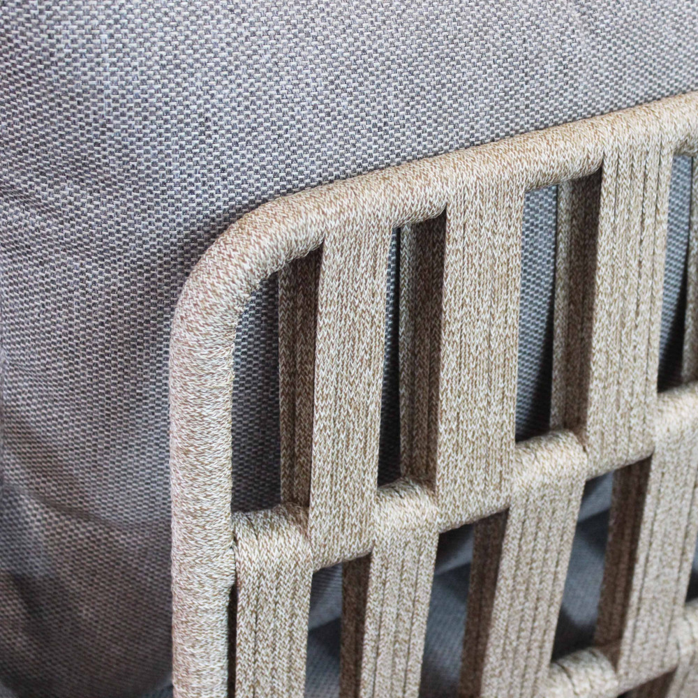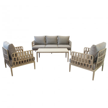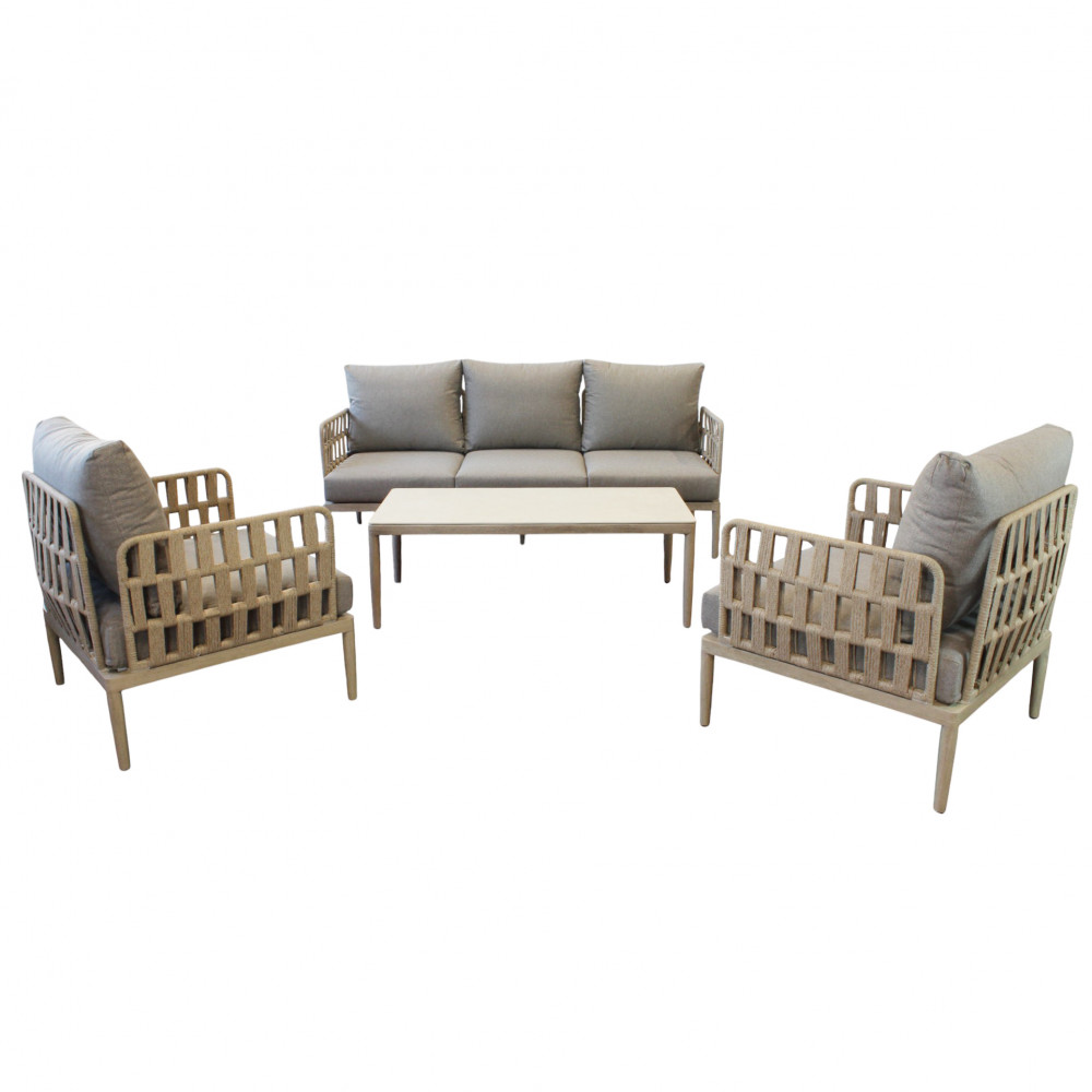 Struttura in alluminio grigio chiaro, naturale o antracite rivestimento in corda in pvc con cuscini Dimensioni: Poltrona: cm 81x80x75 Tavolino: cm 120x60x42 Divano: cm 191x80x75