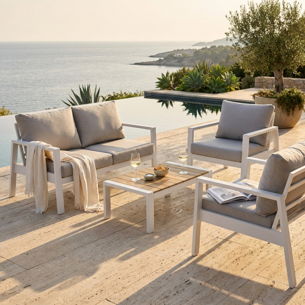 Struttura in alluminio verniciato antracite o bianco cuscini 10 cm Dimensioni: Divano: cm 138x84x83 Poltrona: cm 75x84x83 Tavolino: cm 90x50x35