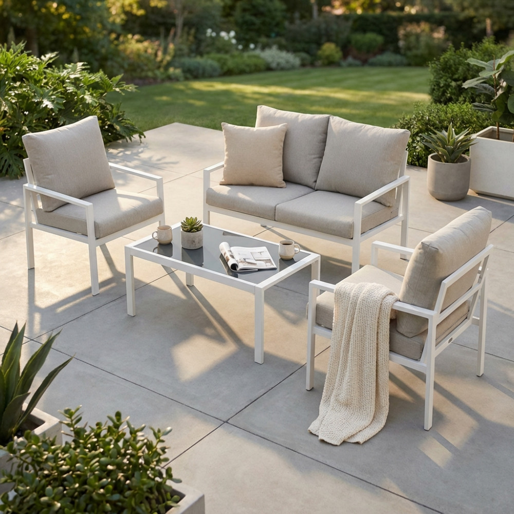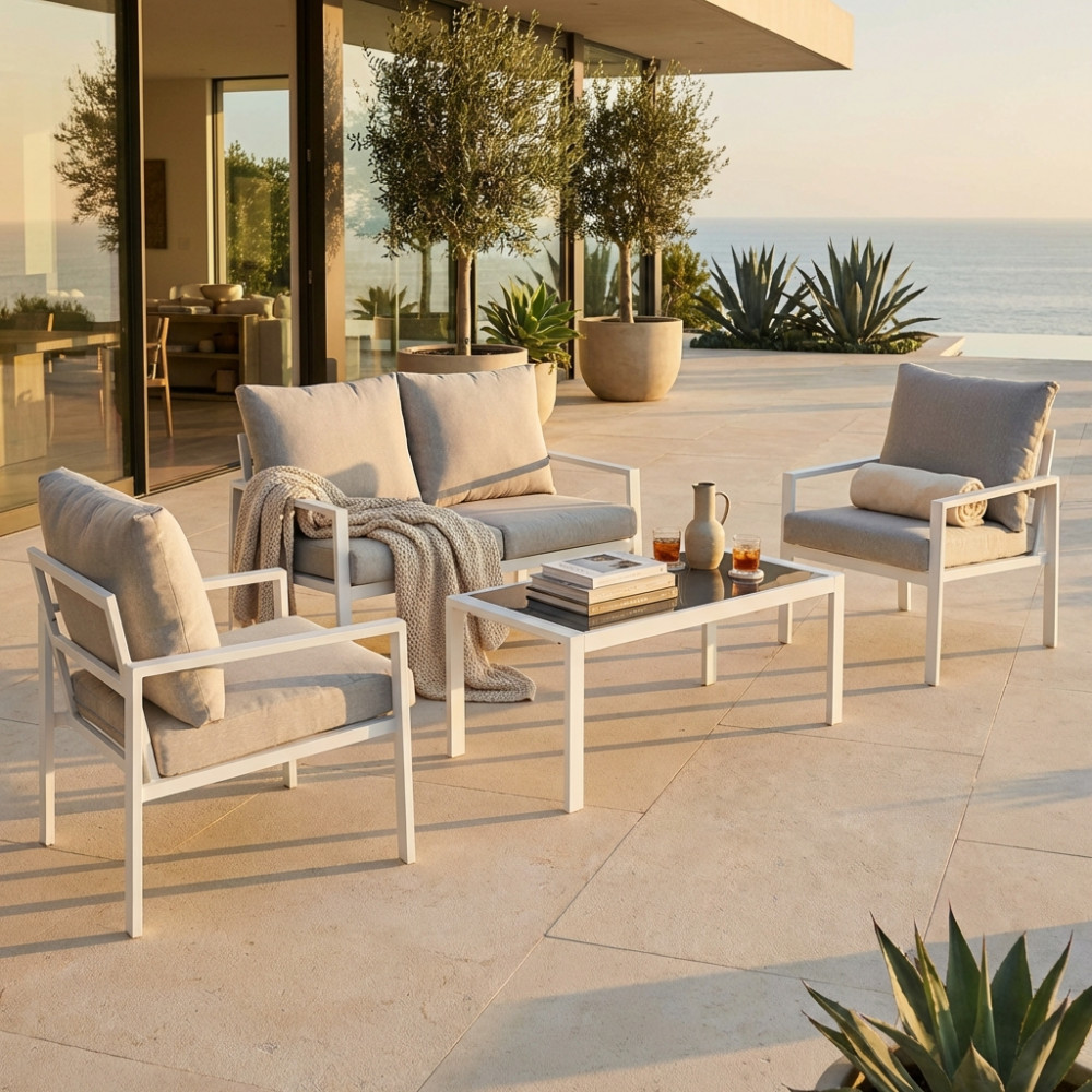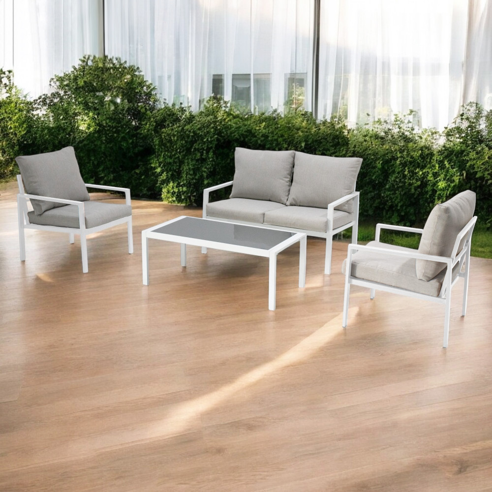 Struttura in alluminio verniciato antracite o bianco cuscini 9 cm Dimensioni: Divano: cm 114x68x75 Poltrona: cm 61x68x75 Tavolino: cm 105x53x40