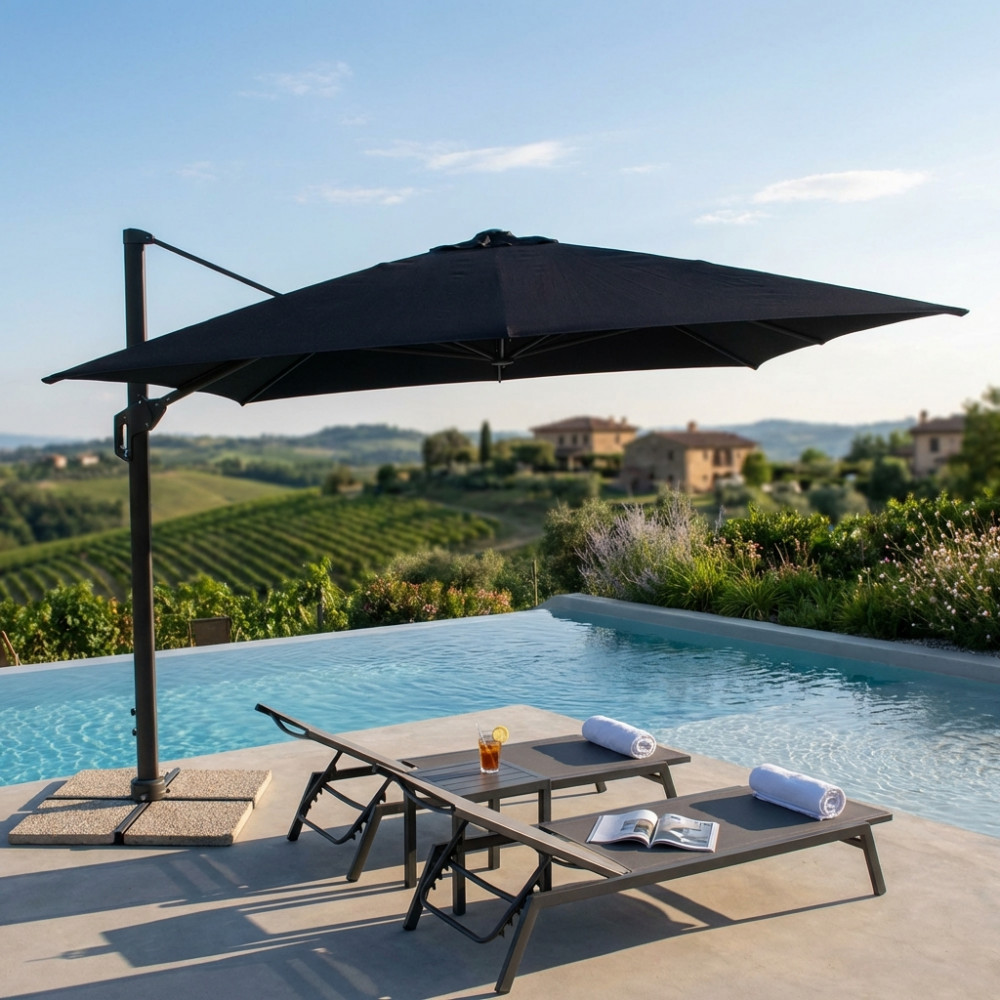 Telo in poliestere nero 250 gr con antivento palo girevole in alluminio 62x102 e 38x52 mm Dimensioni: cm 300 l x 300 p x 265 h