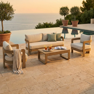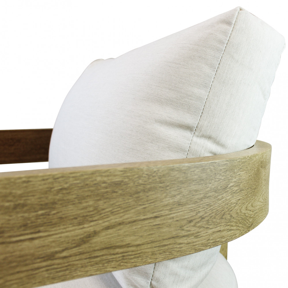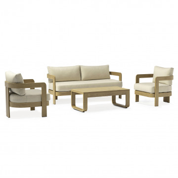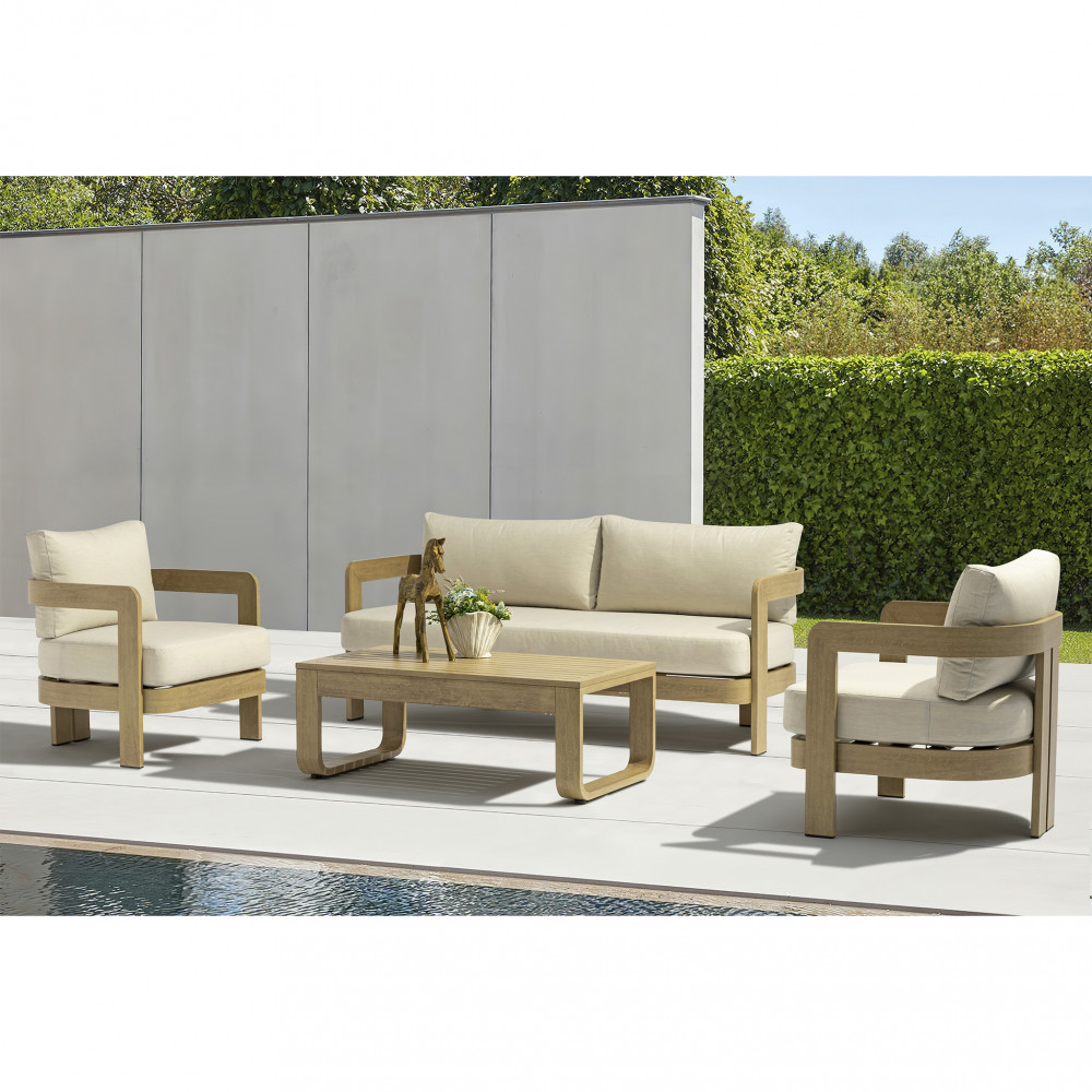 Struttura in alluminio verniciato effetto legno cuscini beige 15 cm Dimensioni: Divano: cm 185x72,5x66 Poltrona: cm 75x72,5x66 Tavolino: cm 110x60 41