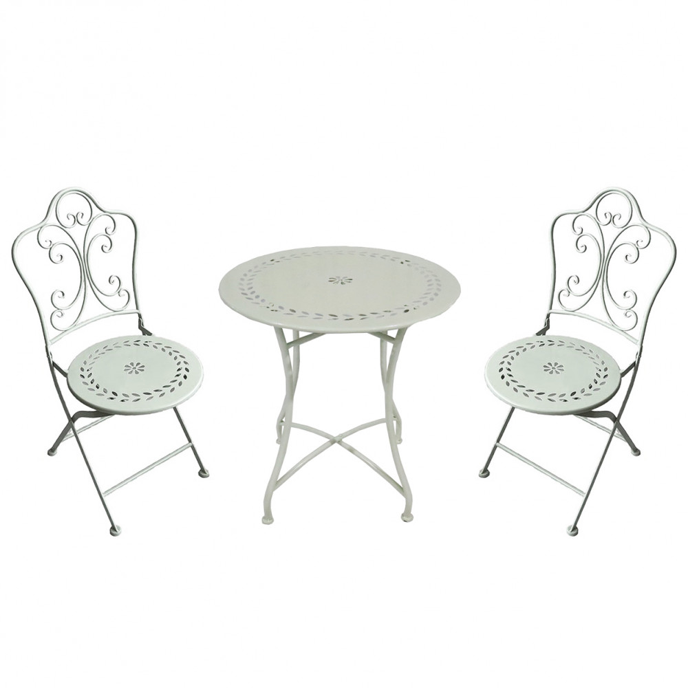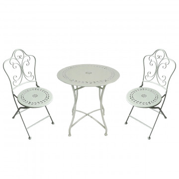 Piano rotondo, schienale e seduta con decoro base in ferro verniciato a polvere bianco Dimensioni: cm 60 Ø x 75 h
